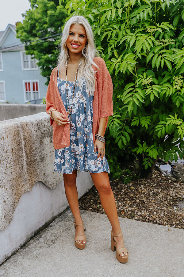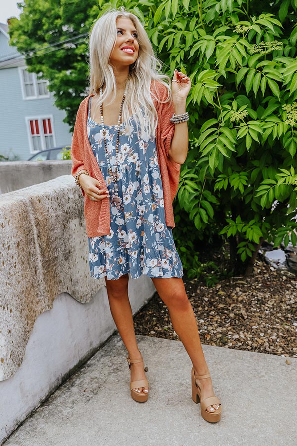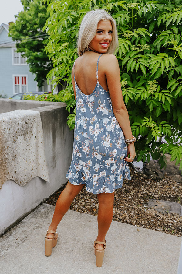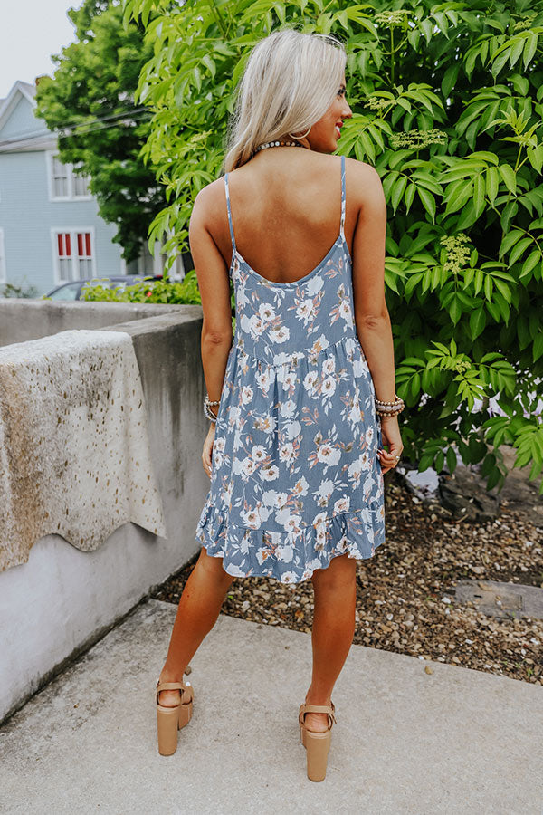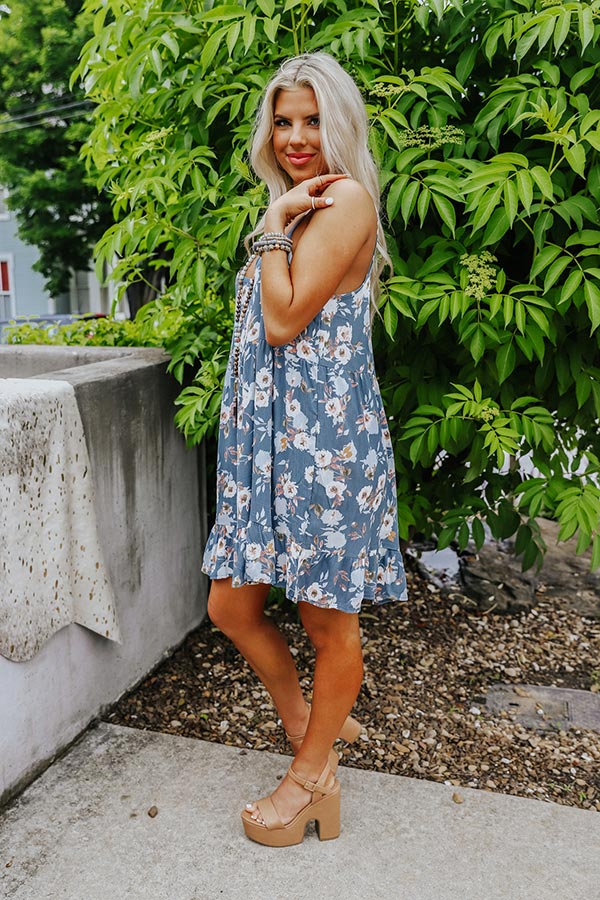 Channel all the summer girl vibes with this pretty slate hued dress featuring lightweight flowy material patterned with a white and natural floral print, a scooped neckline and upper back with adjustable spaghettis traps, and a relaxed silhouette that falls into an uneven mid-thigh length hemline! Measurements