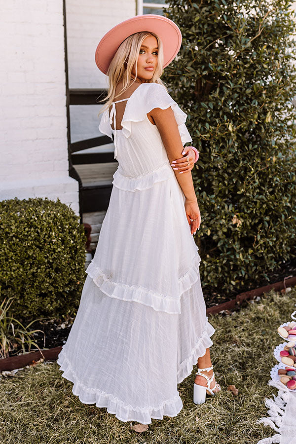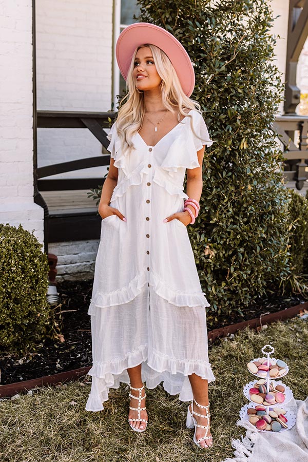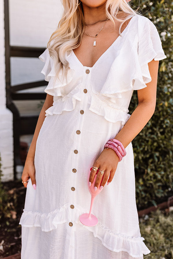 Dress to impress in our stunning white 'Summer Hot Spot Midi' featuring lightweight material with ruffled seam accents throughout, a button down front with a v-cut neckline, short overlay sleeves, hidden side pockets, an open upper back with a tie closure, and a relaxed silhouette that cascades into an uneven mid-calf length hemline!