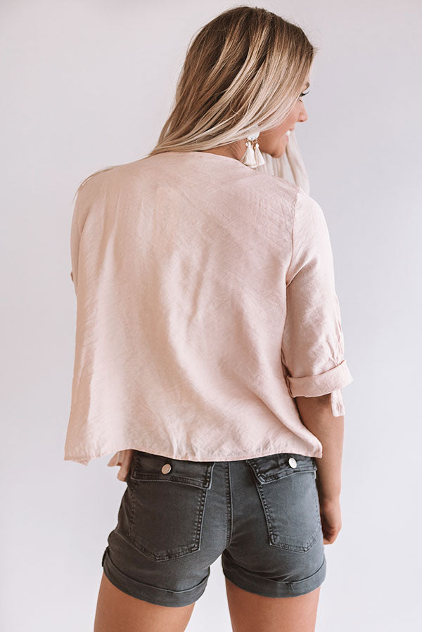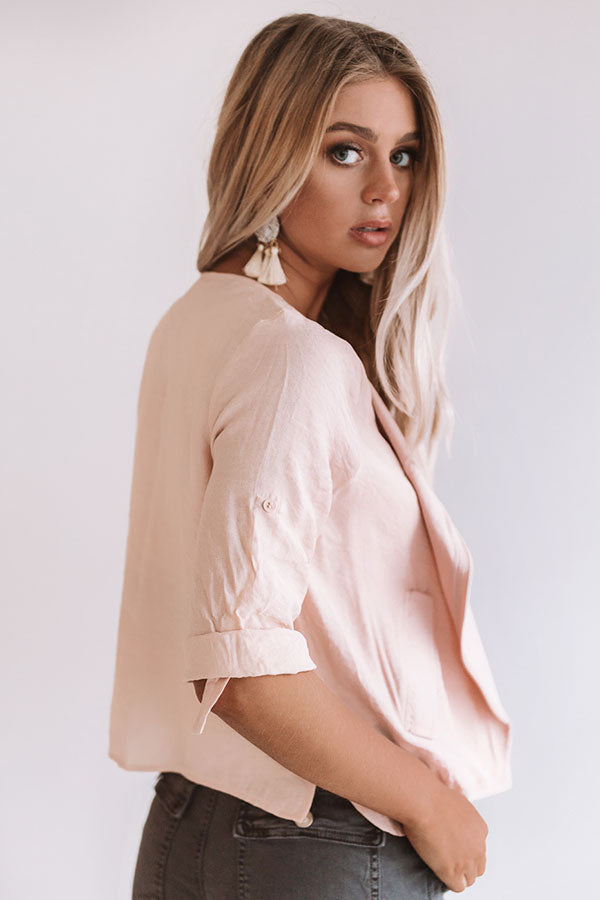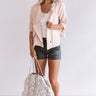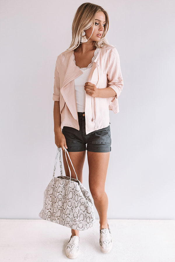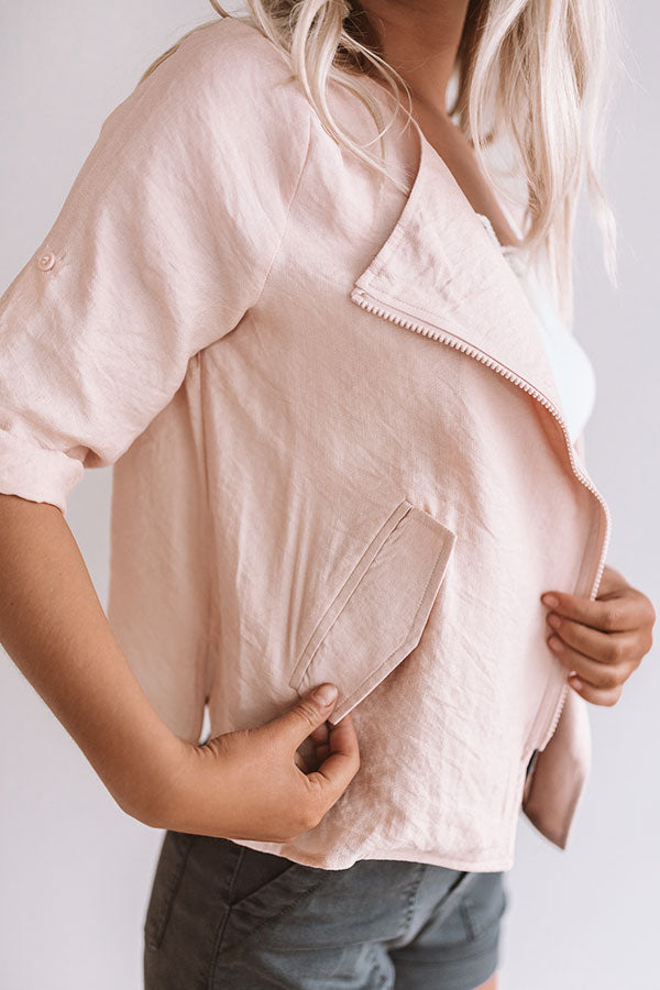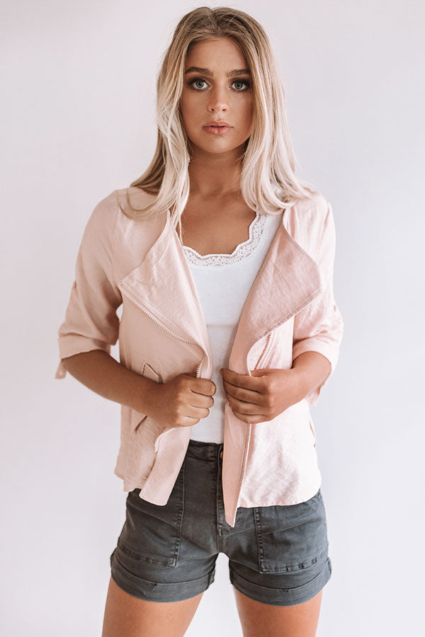 This rose quartz jacket is perfect for keeping you warm year round on those chilly spring mornings and cool "summer nights" with its lightweight material, loose quarter-length sleeves, angled flap accent pocket, and asymmetrical flap zip-front bodice that falls into a straight hemline! To style this piece for a night out you can wear it over a simple tee with some black shorts, statement earrings, and a leopard tote and sneakers, but to dress it up for work, you can swap the shorts for "The Fletcher High Waist Trousers in Iced Latte," the tee for a satin cream tank, and then finish off your OOTD with "The Seraphina Faux Leather Wedge in Taupe!"