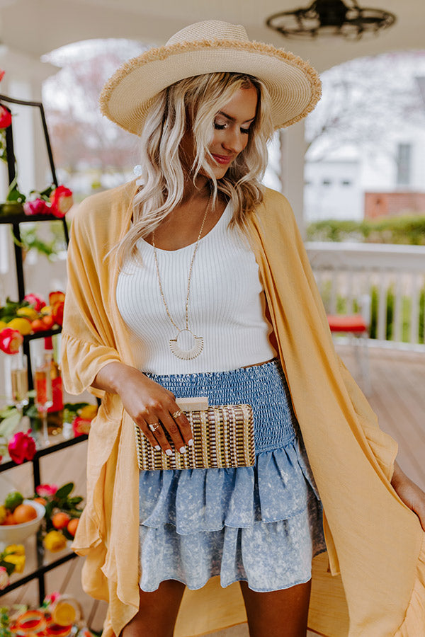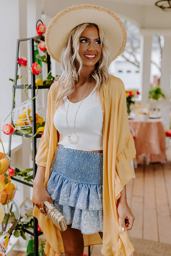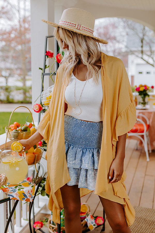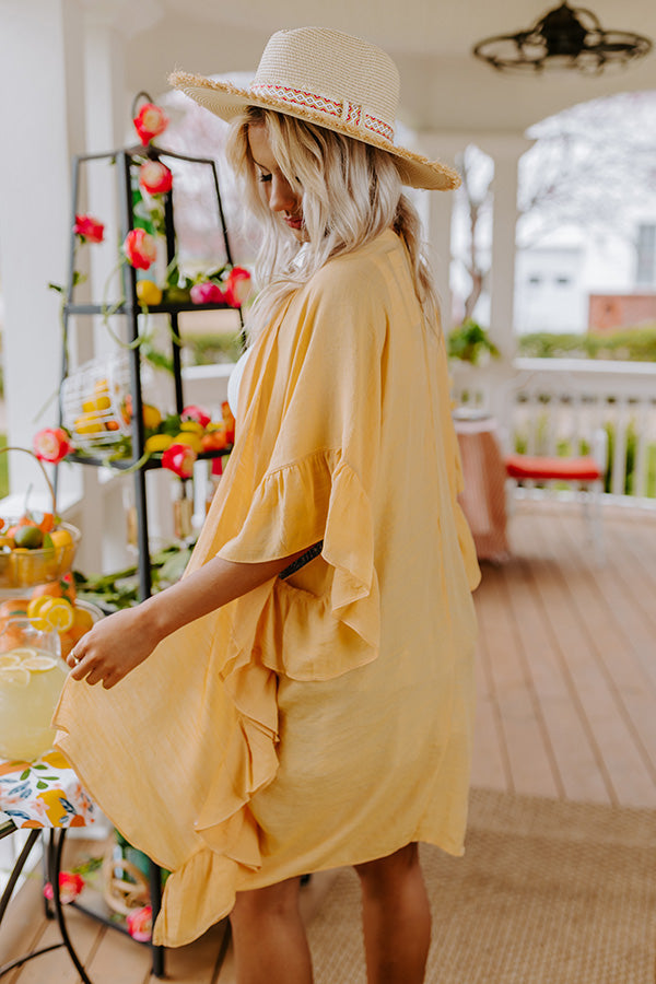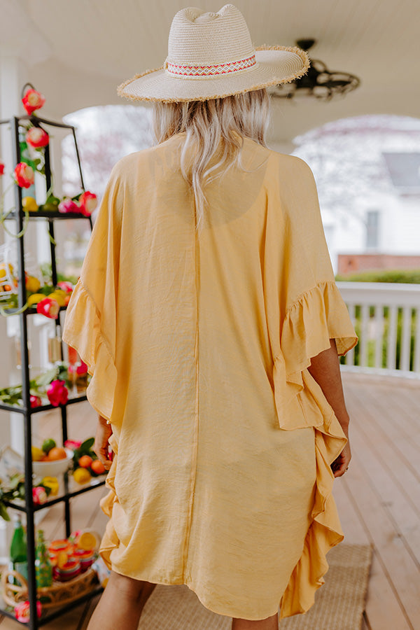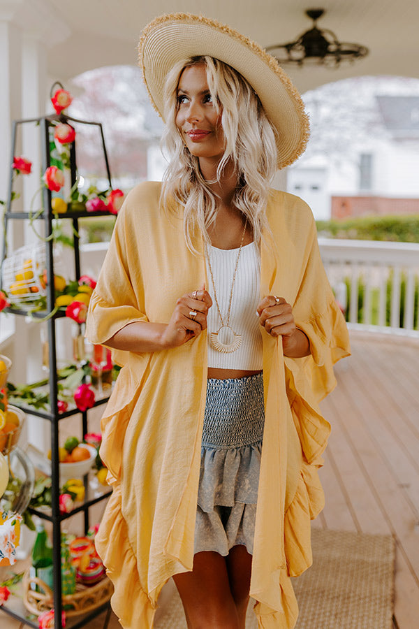 Dance to the beat of your own tune in our adorable primrose yellow colored 'Summer Rhythm' overlay featuring lightweight material, loose 3/4-length sleeves with ruffled cuffs, and a draped open-front silhouette that falls into a straight mid-thigh length hemline! on products
