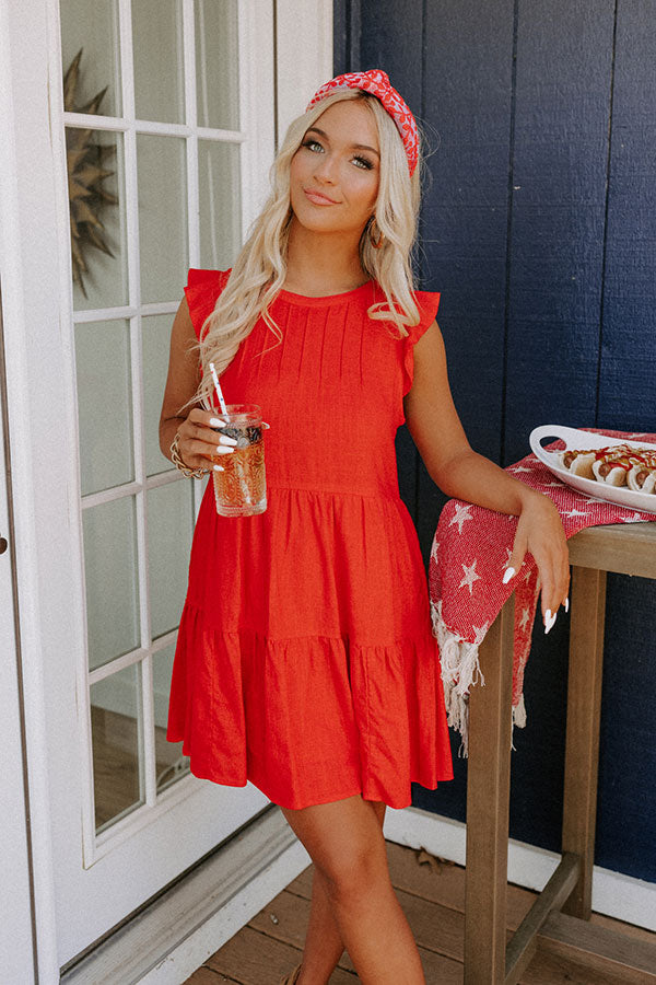 Dance to the beat of your own tune in our red hot 'Summer Rhythm Shift Dress' featuring lightweight material, a rounded neckline, ruffled cap sleeves, a keyhole accented upper back with a button closure, hidden side pockets, and a relaxed tiered silhouette that falls into a straight mid-thigh length hemline! on products