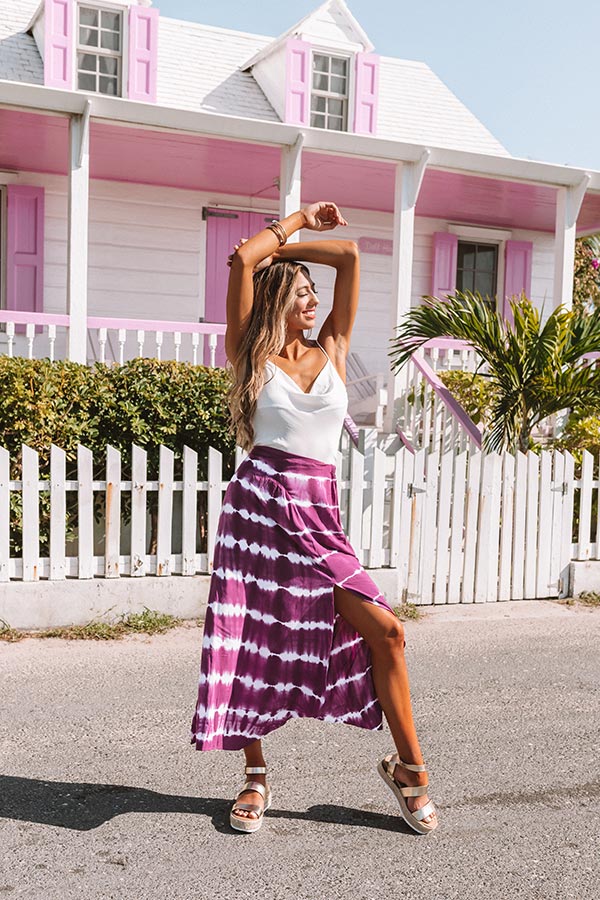 Make a "summer splash" with this adorable dark purple hued skirt featuring soft lightweight material patterned with a horizontal white tie dye print, a wide elastic waistline, and an ultra relaxed silhouette that falls into an uneven mid-calf length hemline with thigh high side slits! You can style this intricate piece a variety of ways, like with a basic white tank and gold espadrilles, but you can also wear it with a black tee and "The Lyla Sandal in Black!" Measurements