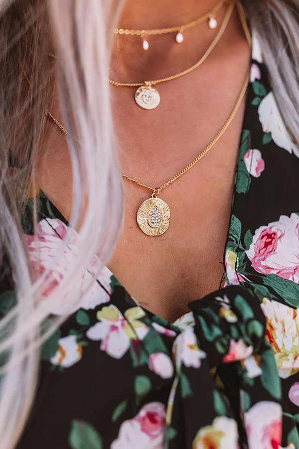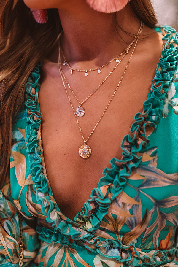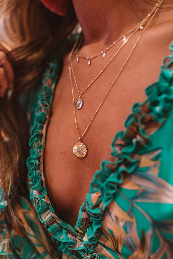 Sway through summer in style by accessorizing with this adorable layered necklace featuring three dainty gold chains with rhinestone accents and stamped circle charms!