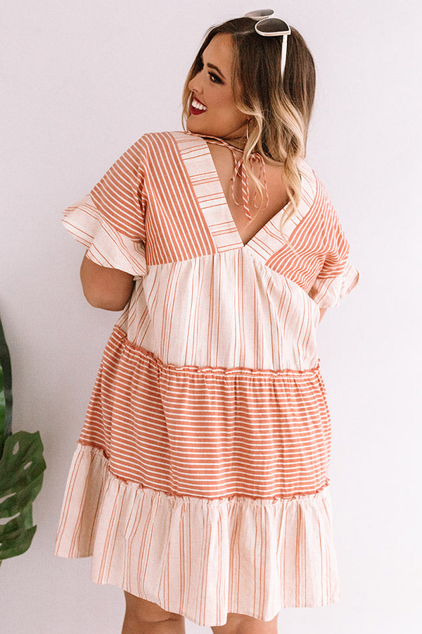 Plus Size - Sway through summer in style with this adorable rust hued dress featuring soft lightweight linen material patterned with various sized horizontal and vertical stripe panels, a v-cut neckline and upper back with a tie closure, short looses sleeves with flared cuffs, ruffled exposed accent seams, and an ultra relaxed silhouette that falls into an uneven mid-thigh length hemline! We have paired this amazing piece with neutral wedges, an ivory net bag, and sunnies, but you can also wear it with "The Jess Faux Suede Heel in Natural" and our "Chic In Santorini Earrings in Ivory!" Measurements