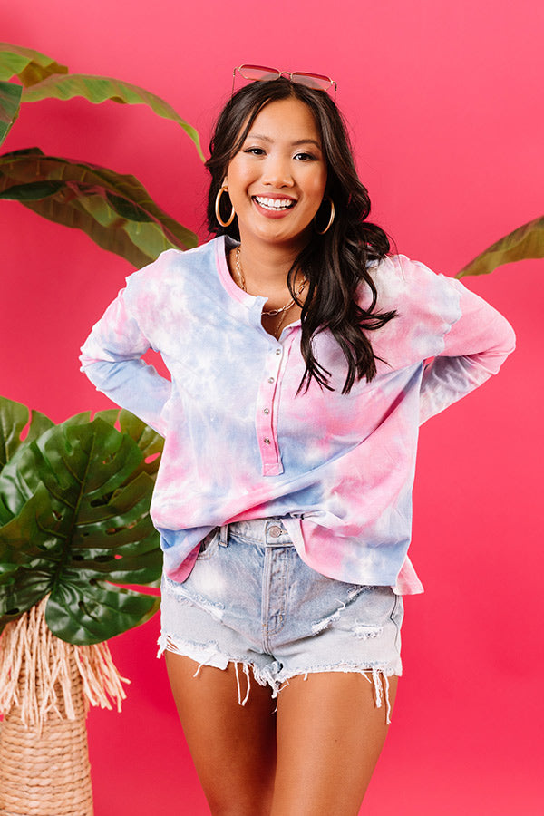 Dance to the tune of summer in this trendy henley tee featuring soft lightweight material patterned with blue and pink hued tie dye, a button up bodice with a high neckline, long loose sleeves, and a slouched silhouette that ends in a straight hemline! Measurements
