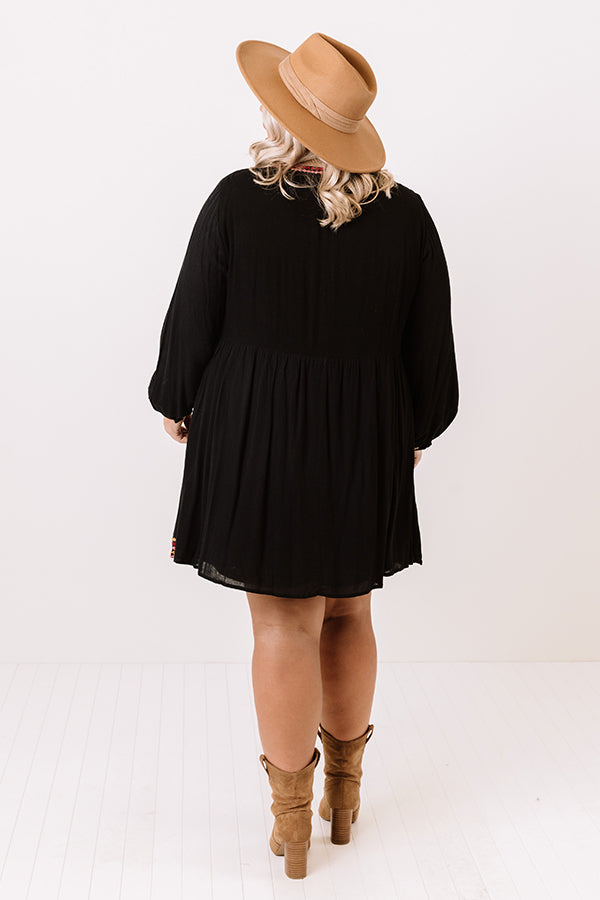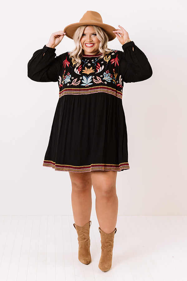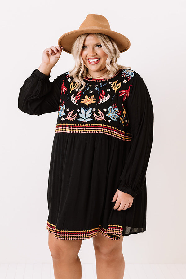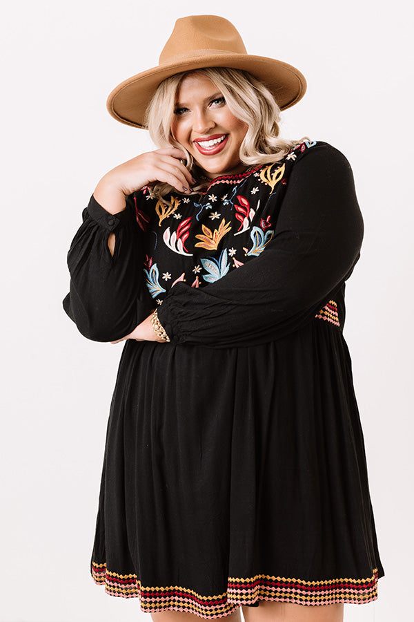 Plus Size - Turn heads in our unique black 'Summit Place' shift dress featuring lightweight breezy material with intricate and colorful embroidered detailing throughout, a high rounded neckline, long loos sleeves with slim fitted cuffs, a keyhole accented upper back with a button closure, and a relaxed skirt silhouette that cascades into an uneven mid-thigh length hemline! Measurements