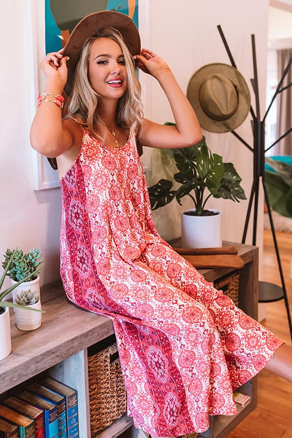 You will surely shine brighter than a "sun ray" when you wear this gorgeous jumpsuit featuring lightweight breezy material patterned with an intricate fuchsia hued pattern, a scooped neckline, adjustable spaghetti straps, a keyhole accented back with a button closure, and an ultra relaxed silhouette that falls into straight mid-calf length hemlines! We have styled this cutie with a brown block heel, faux suede hat, and clutch, but you can also wear it layered under a cropped jean jacket with "The Lela Espadrille in White!" Measurements