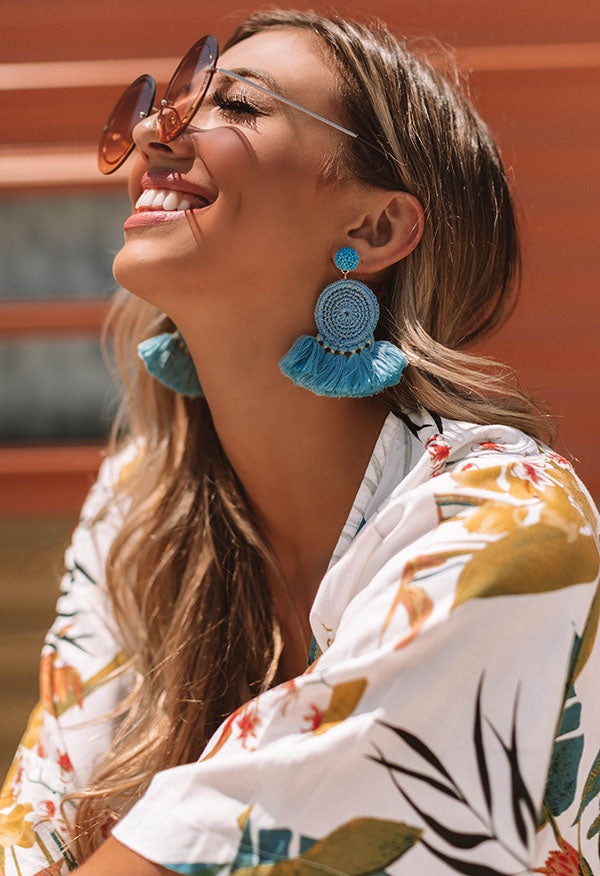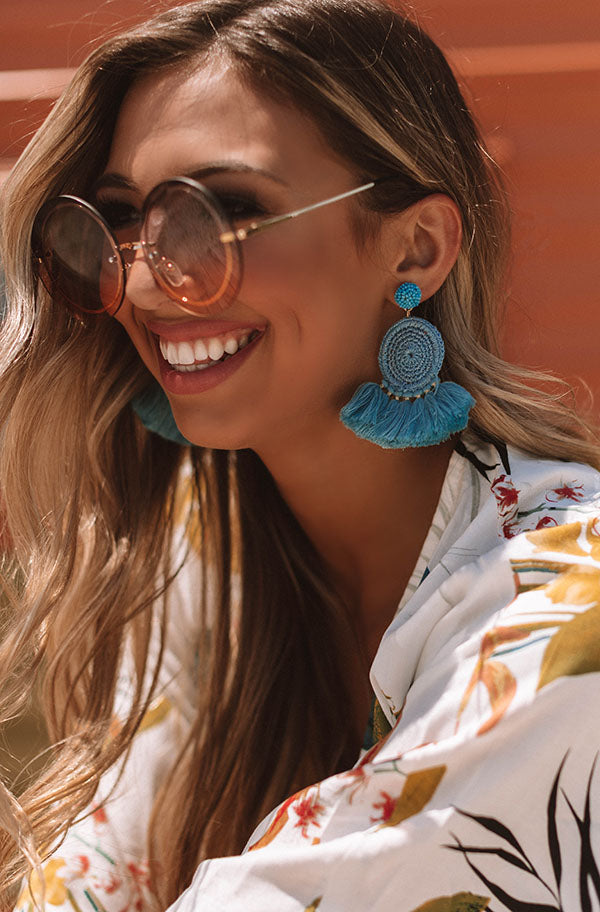 These ocean blue earrings have a beaded stud that is decorated with a crocheted circle and thick tassels that add some extra flare to this already jaw dropping pair!