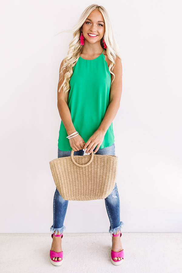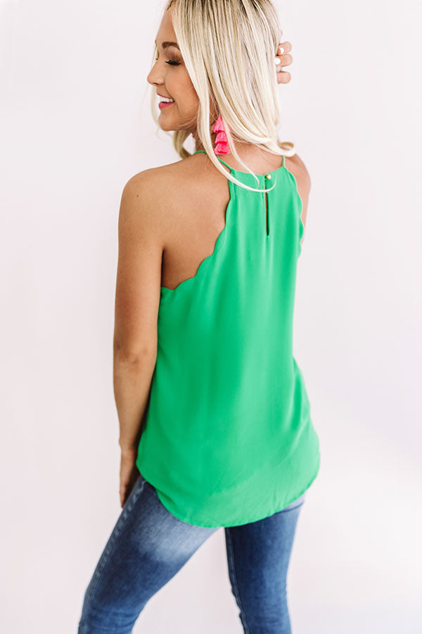 This kelly green shift tank is adorned with scalloped trim under the arms, a high spaghetti strap neckline, a keyhole cutout with a button closure in the back, and a sewed in slip layer for more coverage! We styled this piece with distressed jeans, but it can also be paired with a floral summer skirt and a white crossbody for the ultimate suncatcher outfit! Measurements