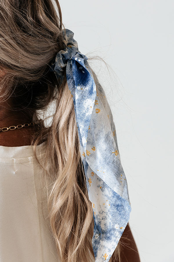 Take a Sunday drive looking fabulous with this adoarble hair scrunchie featuring a stretchy band with a blue tie dye scarf attached!