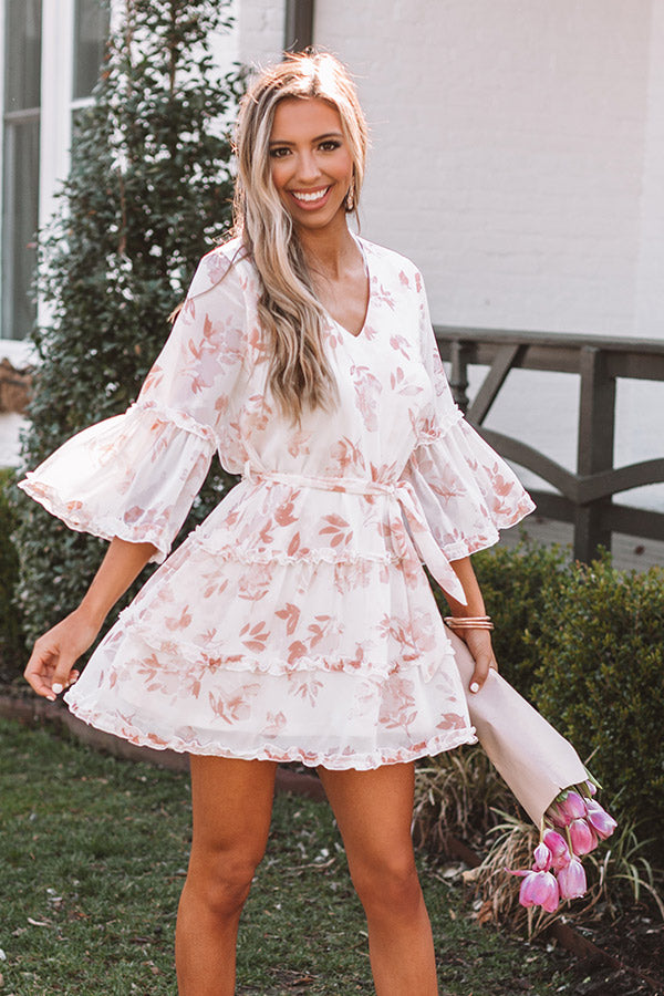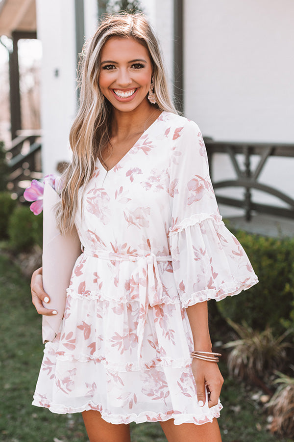 Slay all day in our stunning white "Sunday Simplicity Shift Dress" featuring lightweight breezy material patterned with a peach colored floral print, a v-cut neckline, loose 3/4-length sleeves with oversized flared cuffs, a fitted elastic waistline with a tie belt, and a relaxed tiered skirt silhouette that falls into an uneven mid-thigh length hemline! We have styled this cutie with some neutral heels, but you can also wear it with "The Sydney Wedge in Gold" and our "Cute As Can Be Clutch in Gold!" Measurements
