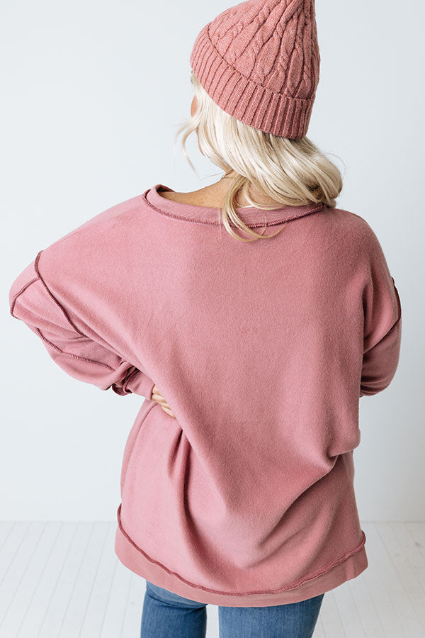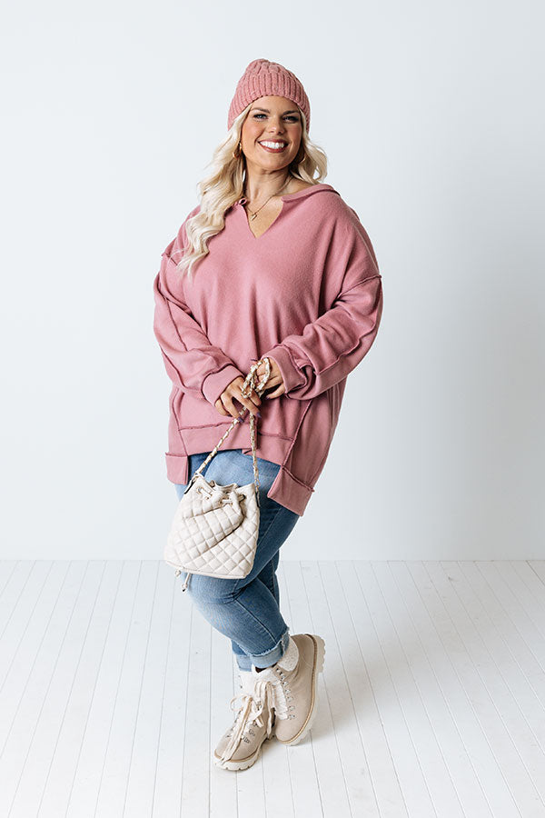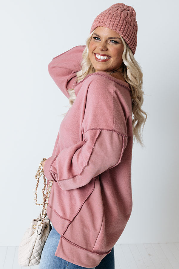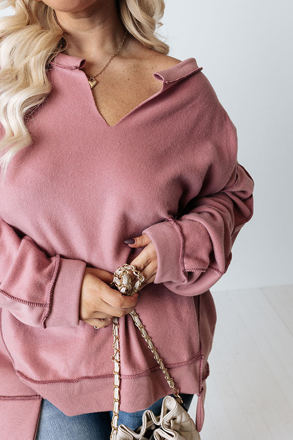 Ward off that sundown chill in style with this casual cute blush colored plus size sweatshirt featuring soft material, a rounded v-cut neckline, long loose sleeves, exposed accent seams, wide trim, and a slouched silhouette that ends in an uneven hemline! Measurements