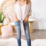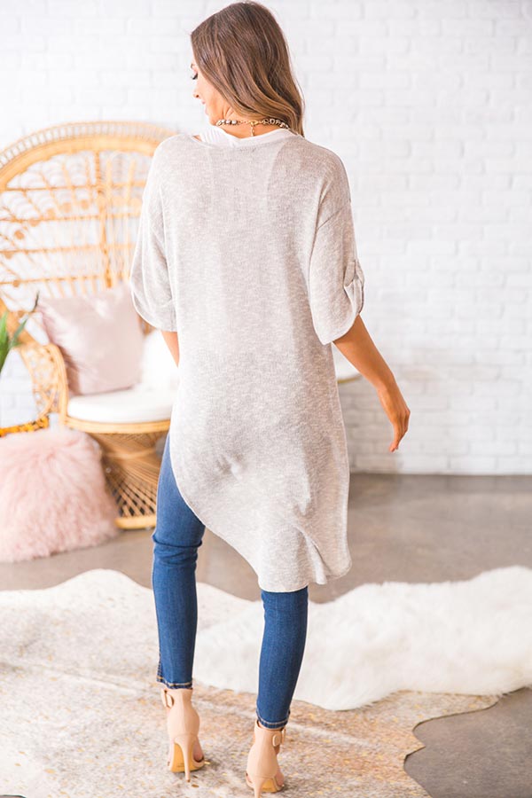 This versatile duster is in KNIT for the long haul! This lightweight grey knit duster has short roll-tab sleeves, and high scooped sides that come together and can be tied in the front.