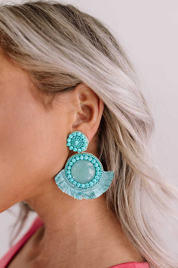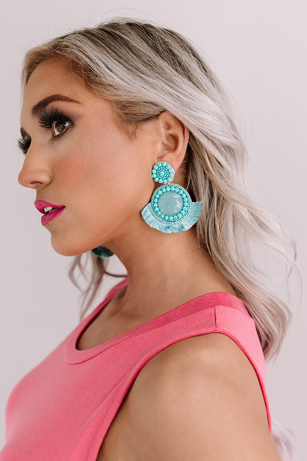 You are sure to look "sunkissed chic" when you accessorize with these adorable turquoise earrings featuring beaded circle studs and larger dangling circles with short accent tassel fans!