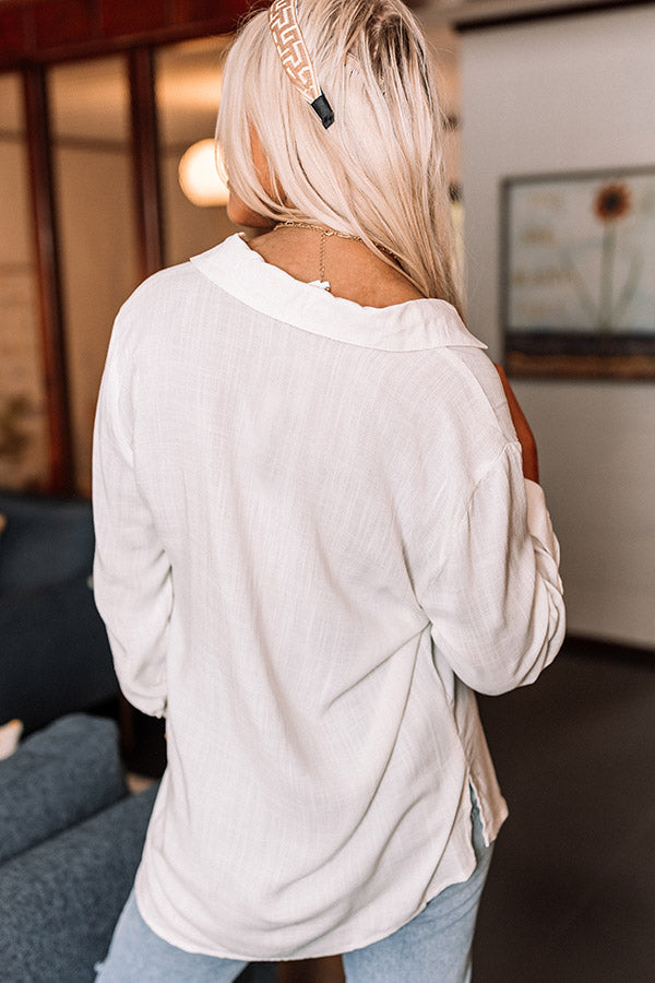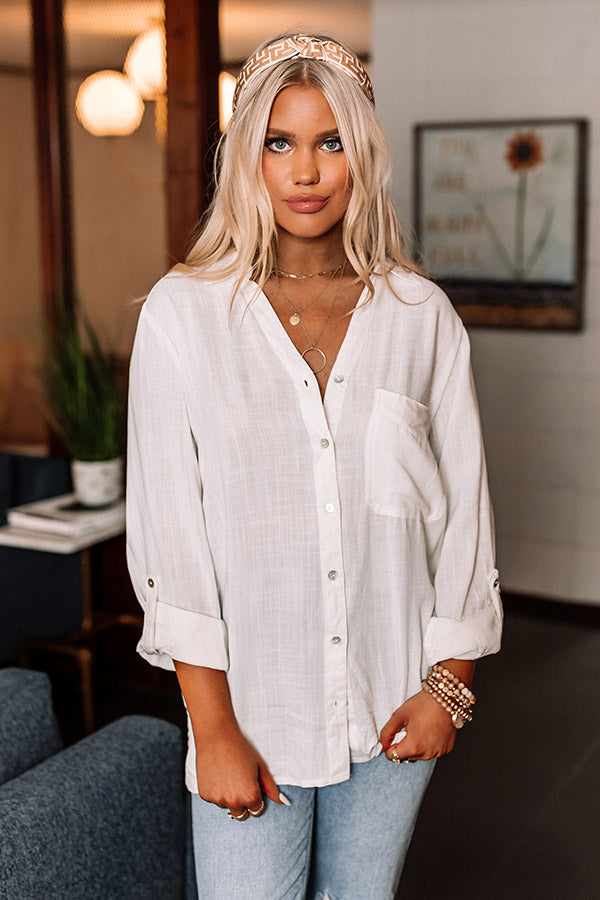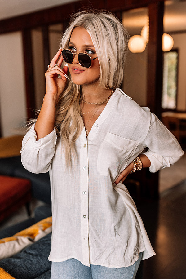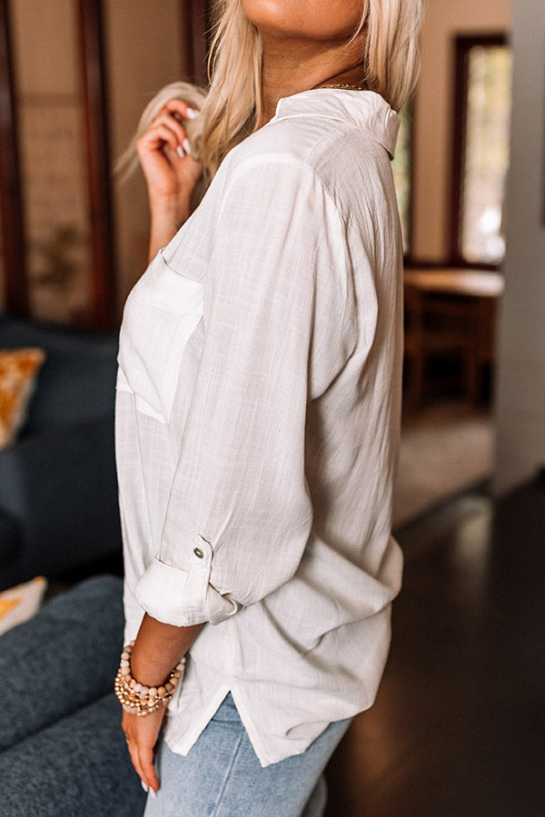Bring on the sunlight in this ivory colored casual cute top featuring lightweight material, a button up front with a collared v-cut neckline, long loose sleeves with roll-tab cuffs, a single accent chest pocket, and a relaxed silhouette that falls into a rounded hemline!