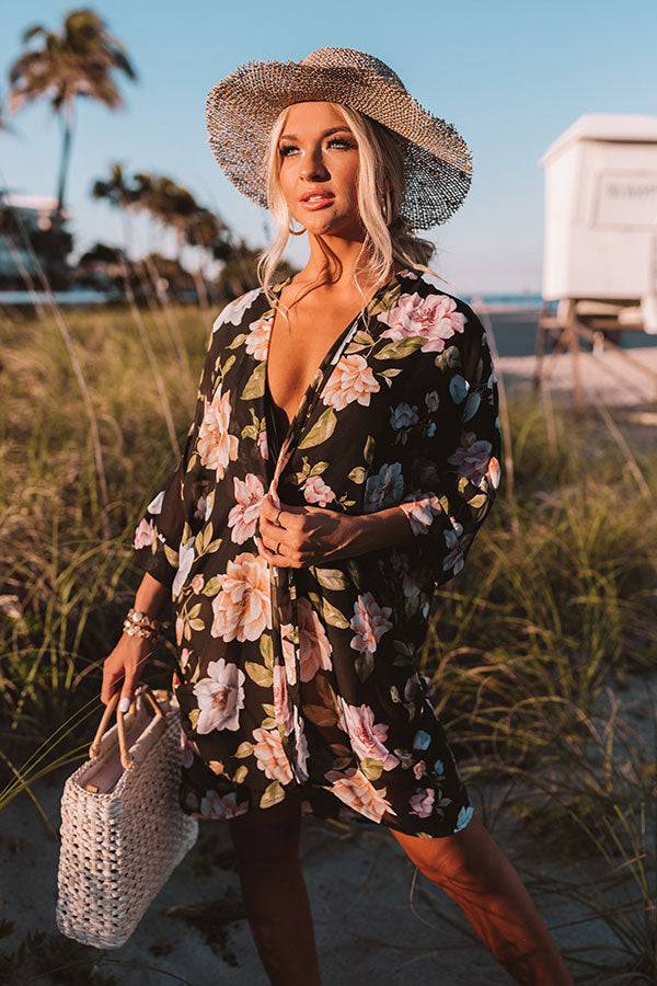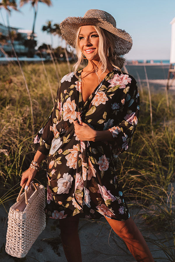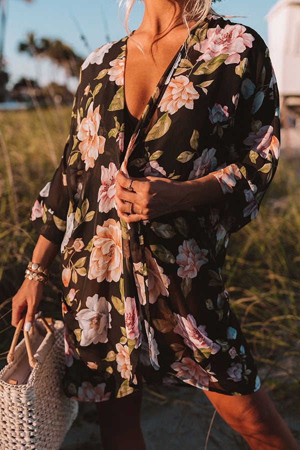 Drape yourself in style this summer with our chic black 'Sunning South Of France' overlay featuring ultra lightweight and breezy chiffon material patterned with a large pastel orange, pink, blue, and green floral print, oversized 3/4-length sleeves, and a relaxed open front silhouette that falls into a straight mid-thigh length hemline! Measurements