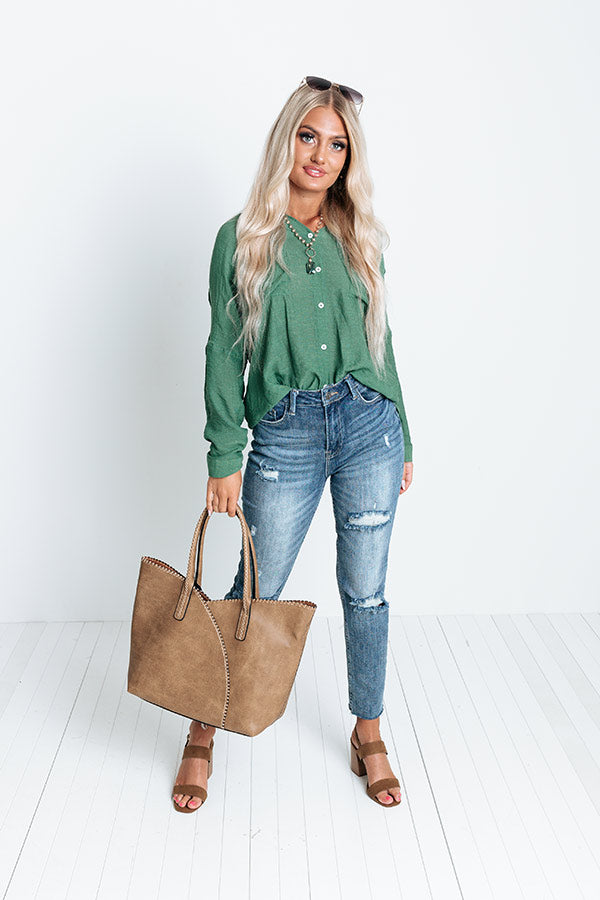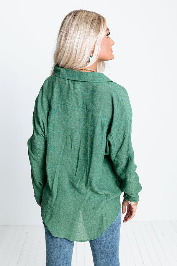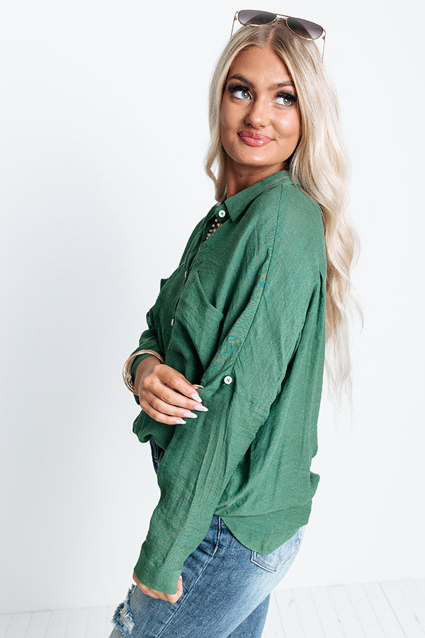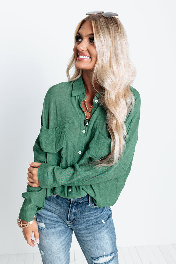 Spend a sunny Saturday in style with this charming green shift top featuring lightweight material, a button down front with a collared neckline, long loose sleeves with roll-tab cuffs, two accent chest pockets, and a relaxed silhouette that falls into a rounded hemline!