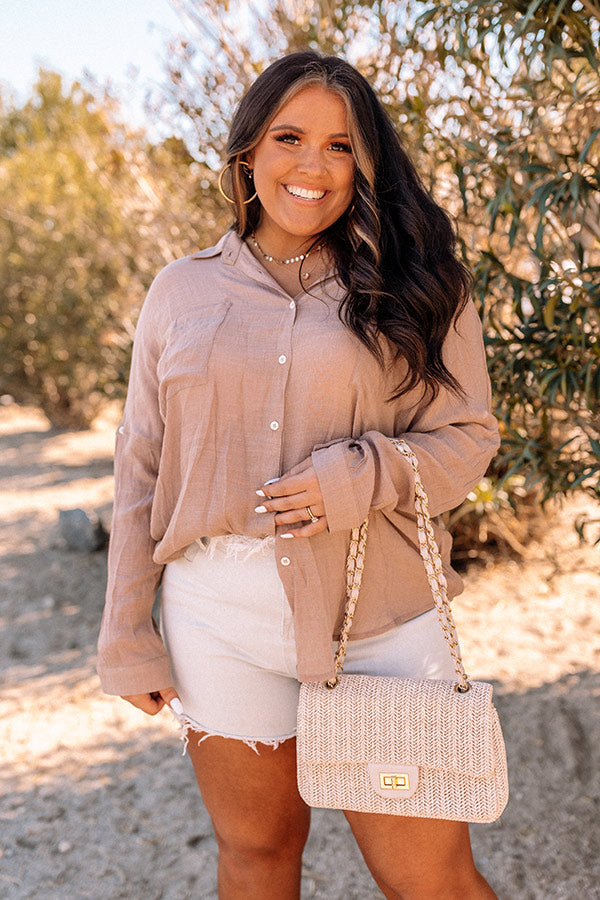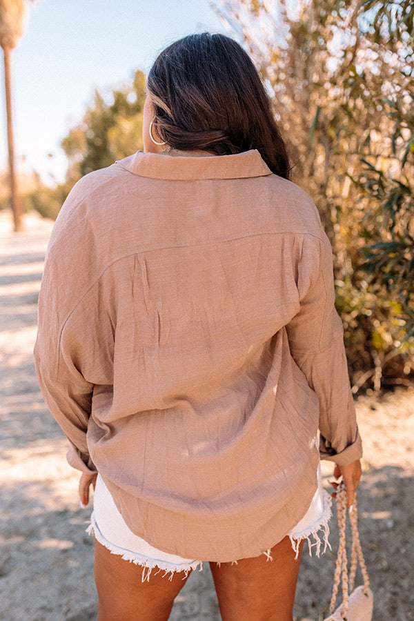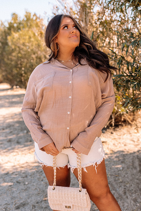 Spend a sunny Saturday in style with this charming plus size warm taupe colored shift top featuring lightweight material, a button down front with a collared neckline, long loose sleeves with roll-tab cuffs, two accent chest pockets, and a relaxed silhouette that falls into a rounded hemline!