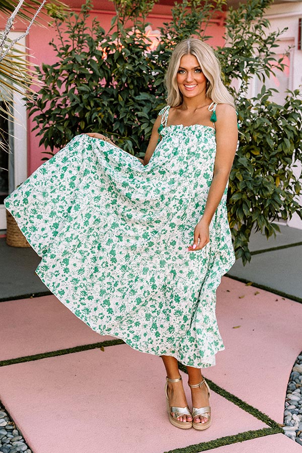 You will look like a sunny sweetie in this darling white midi dress featuring lightweight breezy material patterned with a pretty green floral print, a straight neckline with subtle ruffled trim detailing, tassel tie closure spaghetti straps, and an ultra relaxed silhouette that cascades into a straight ankle-length hemline!