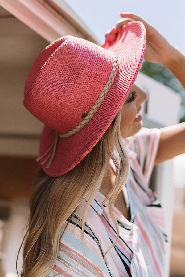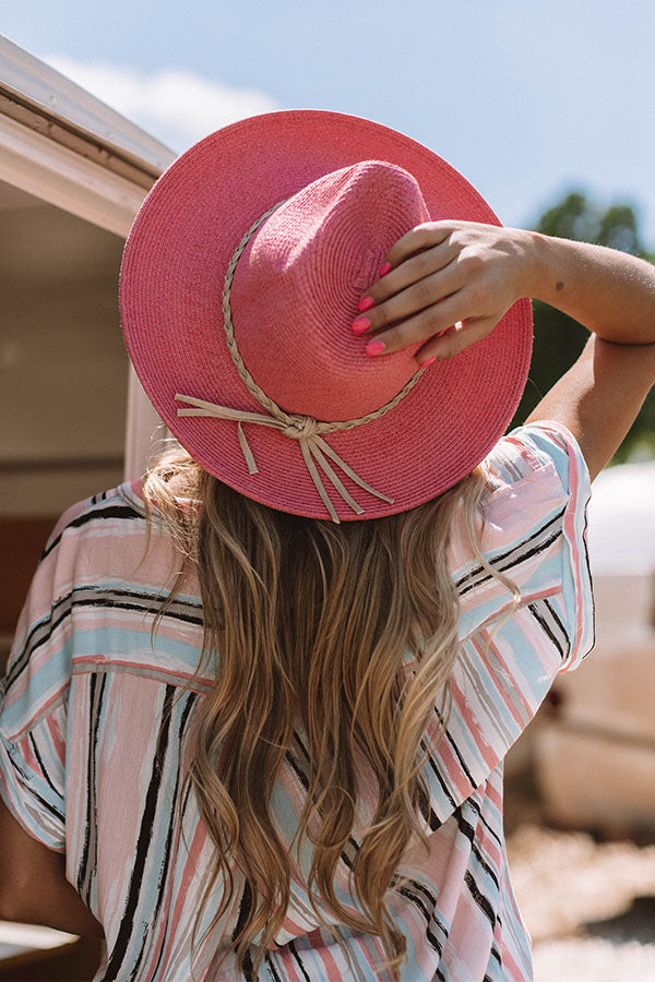 This straw summer hat is the perfect piece to wear for a sunrise beach walk with its coral color, wide brim, and braided accent tie!