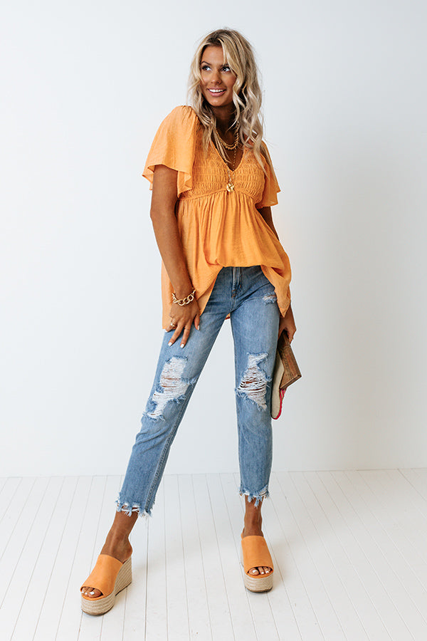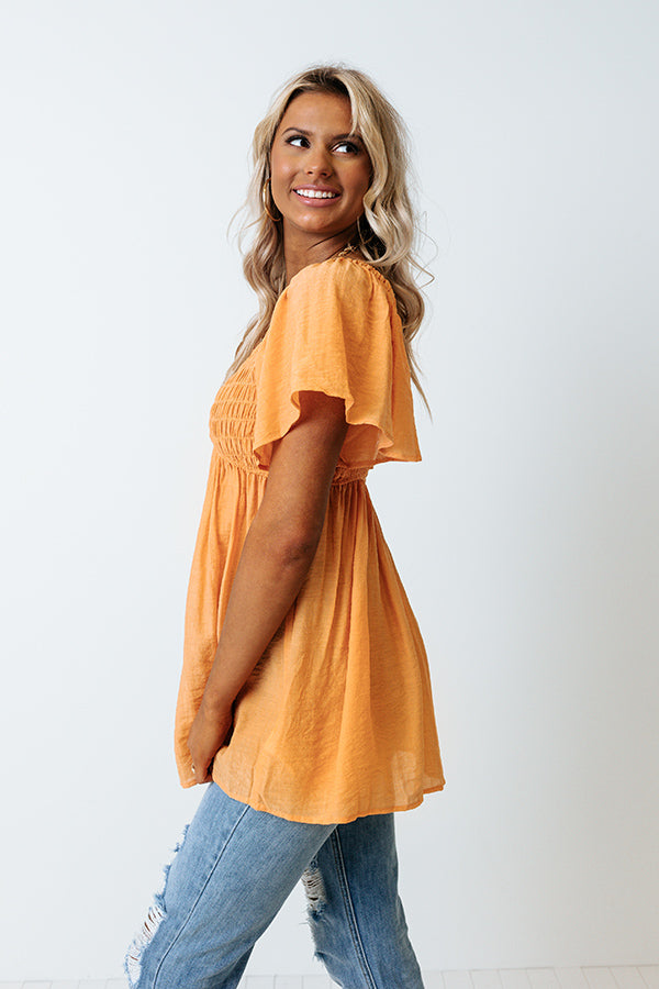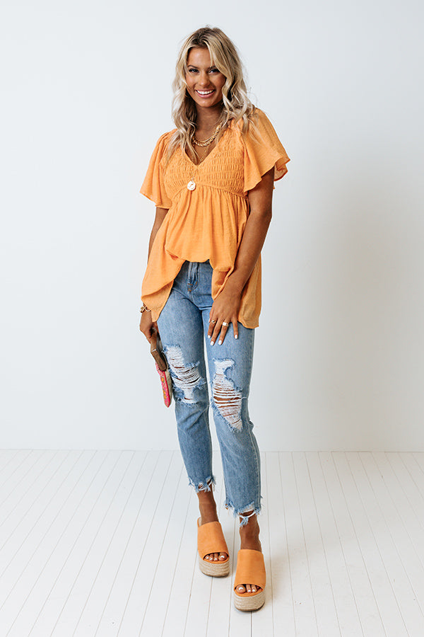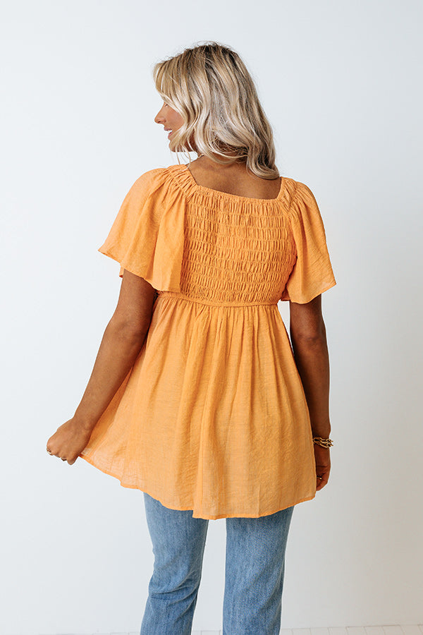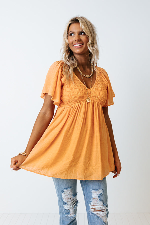 Create your own sunshine in our adorable orange 'Sunrise Kisses' top featuring lightweight material, a smocked bodice with a v-cut neckline, short loose sleeves, and a flattering babydoll silhouette that falls into a straight tunic-length hemline! on products
