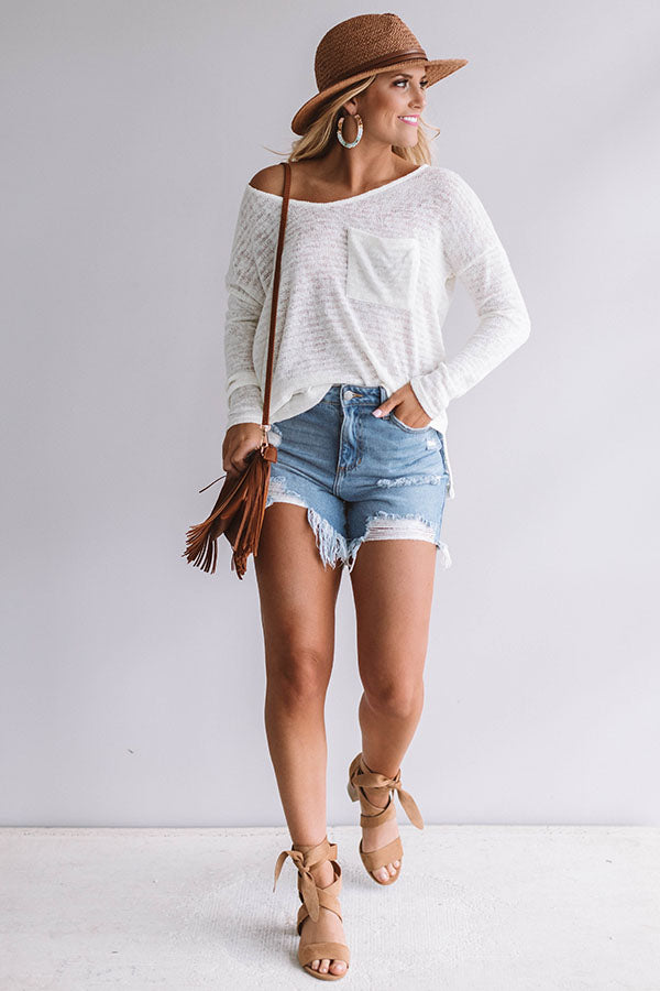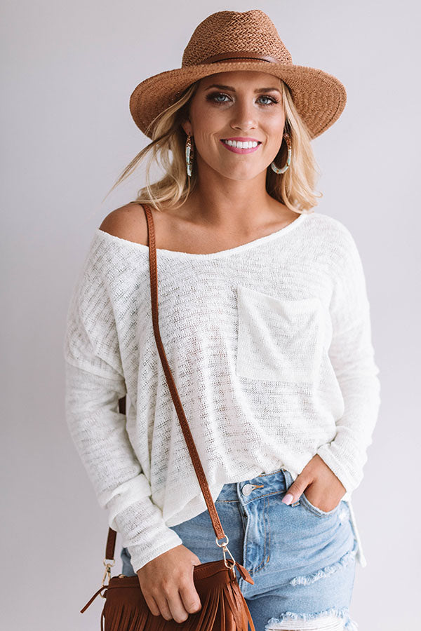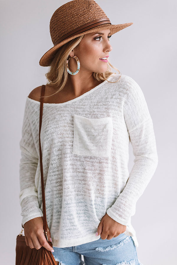 Keep it simple in our upscale ivory colored 'Sunrise Yoga' sweater featuring soft ultra lightweight loose knit material, a wide v-cut neckline, long loose sleeves, a single accent chest pocket, and a slouched silhouette that ends in a straight hemline with side slit detailing! Measurements