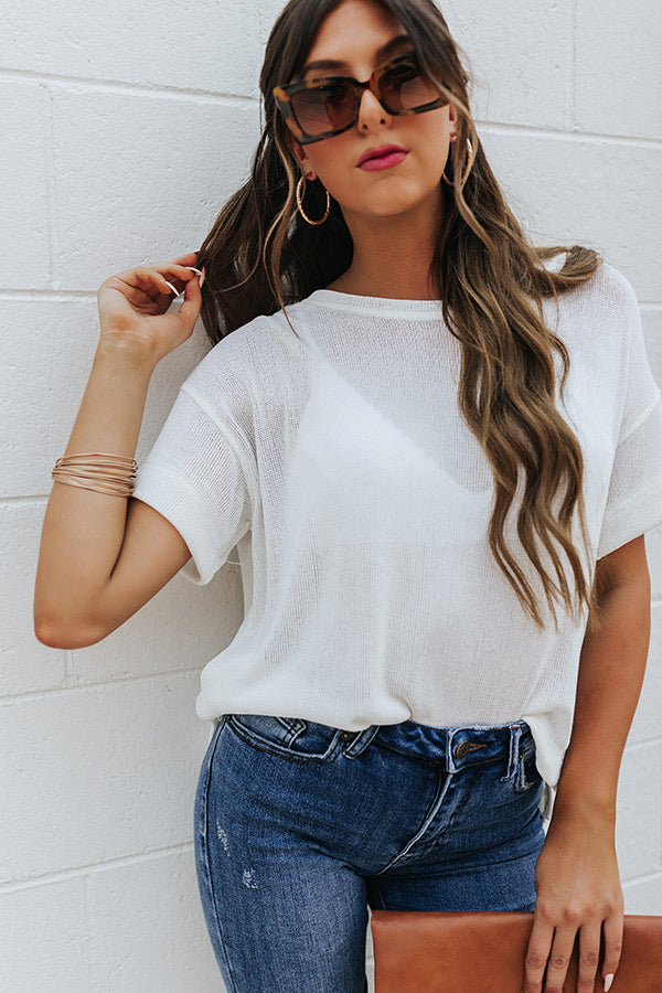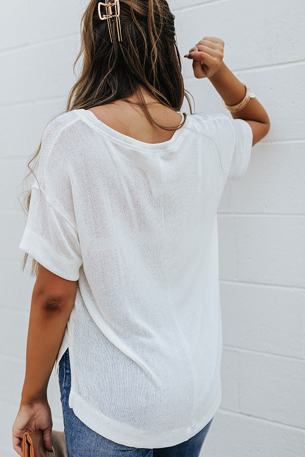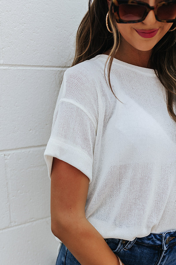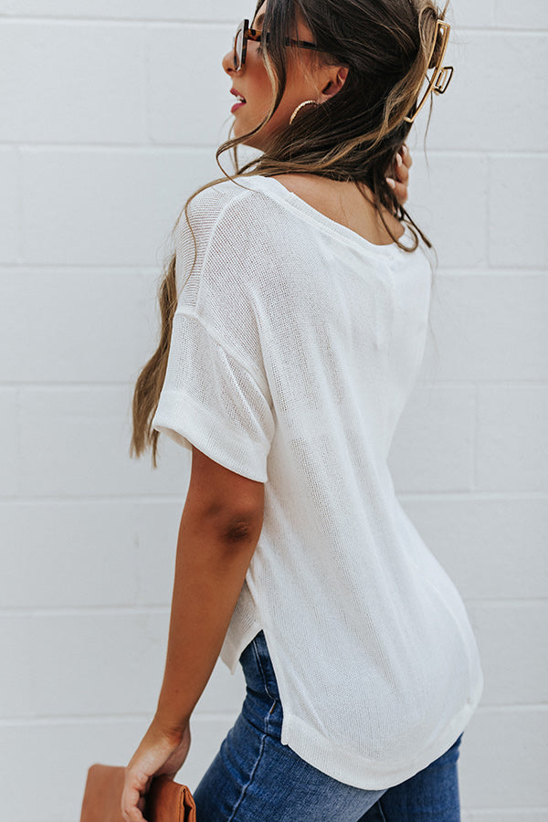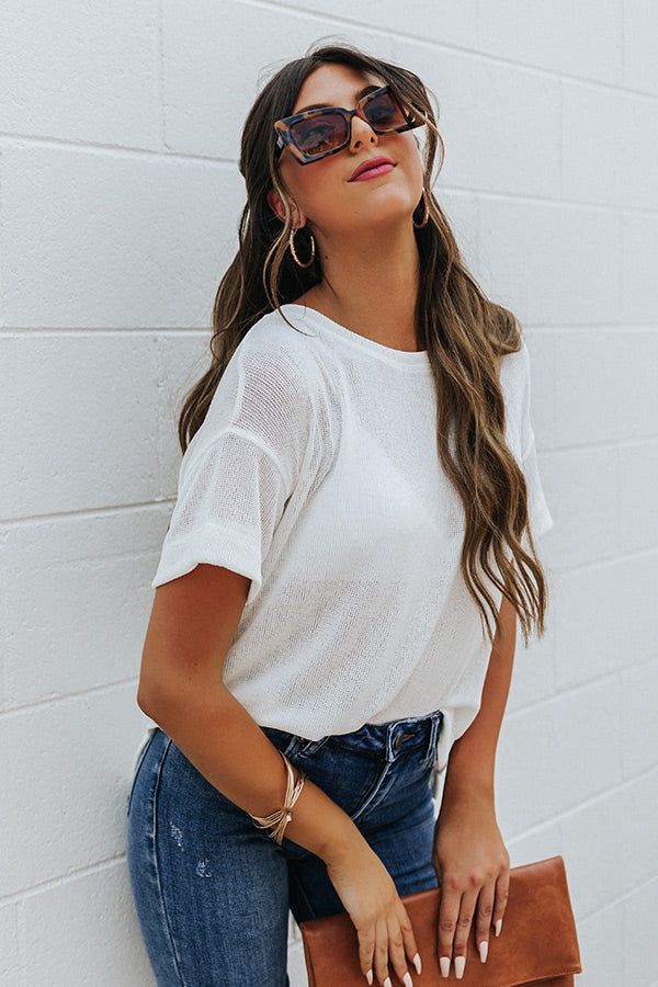Keep it simple but stylish in our casual white 'Sunset Hours' shift tee featuring soft and lightweight tight knit material with subtle texturing, a rounded neckline, short sleeves with wide cuffs, and a slouched silhouette that ends in a rounded hemline with accent side slits! For additional coverage, we recommend layering over your fave bralette or camisole!