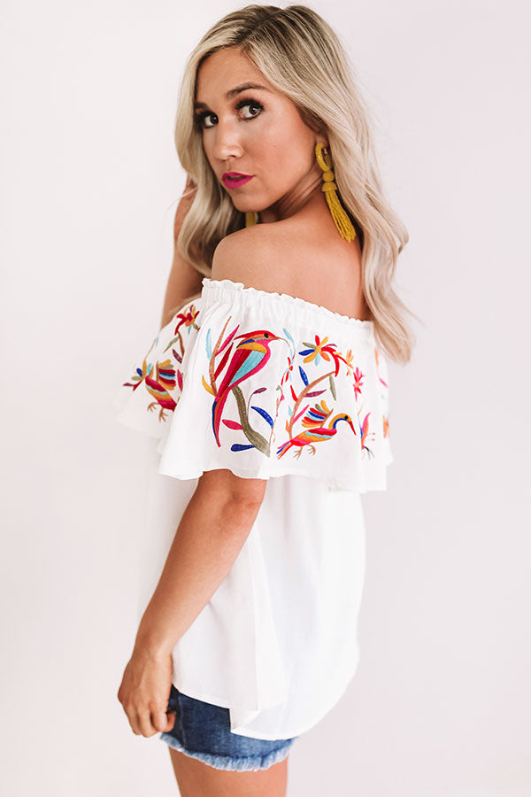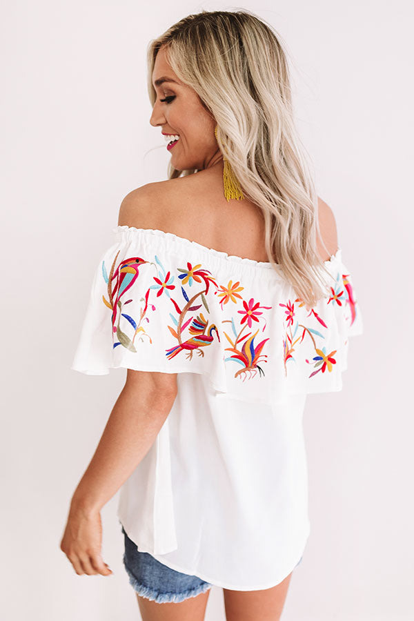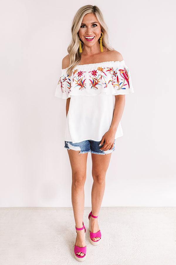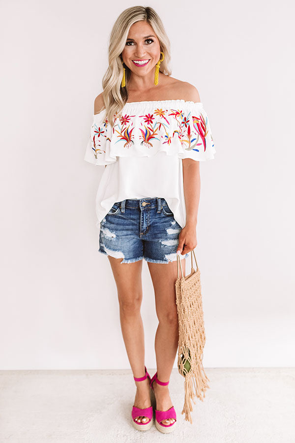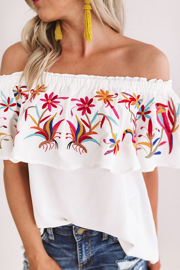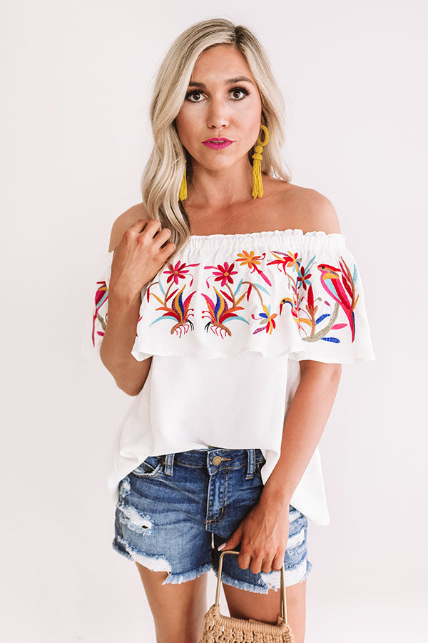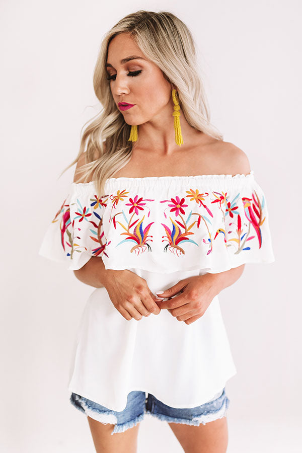 We hope you are relaxing from the ocean calms and sunset palms in this white top with its ruffle off-shoulder fit with elastic stitching, vibrant embroidery, and flirty bodice! This gorgeous piece looks great styled with jean shorts for an everyday look or with our fuchsia "Fabulous in Fiji Trousers," nude heels, and our aqua "Cabana Fever Tassel Earrings" for a fashionable work look! Measurements