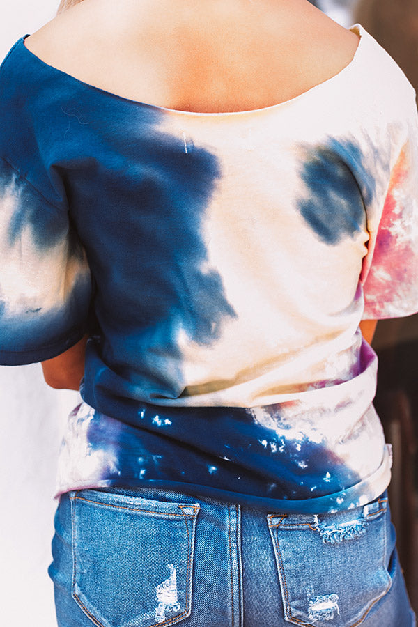 Surf through summer in style with this vibrant tee featuring soft lightweight material patterned with navy, pink, and yellow hued tie dye, a raw cut off-shoulder neckline with short drop sleeves, and a relaxed silhouette that falls into a rounded hemline! We have styled this adorable piece with some distressed denim shorts, sunnies, and trendy white sneakers, but you can also wear it with some frayed white skinnies, "The Alba Wedge in Navy," and our "Beachy Vibes Woven Tote!" Measurements