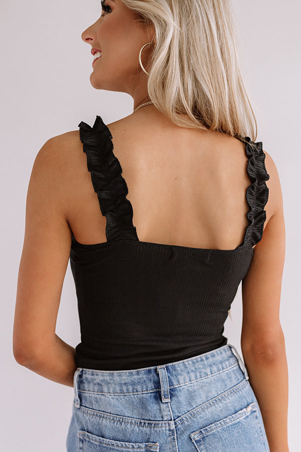 There is no better piece to wear when there is sunshine in the forecast than this adorable black bodysuit featuring lightweight stretchy material with ribbed texturing, a straight neckline and upper back, 1-inch ruffled shoulder straps, and a form fitting silhouette that falls into a cheeky fit with a two snap button closure! You can style this piece under any type of bottoms and wear any type of outerwear with it for a variety of looks that will carry you from season to season! Measurements