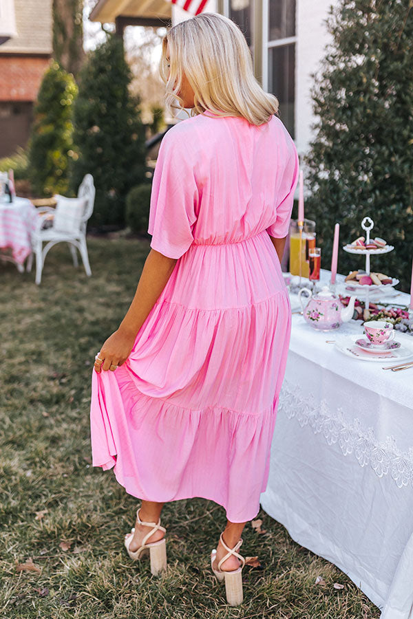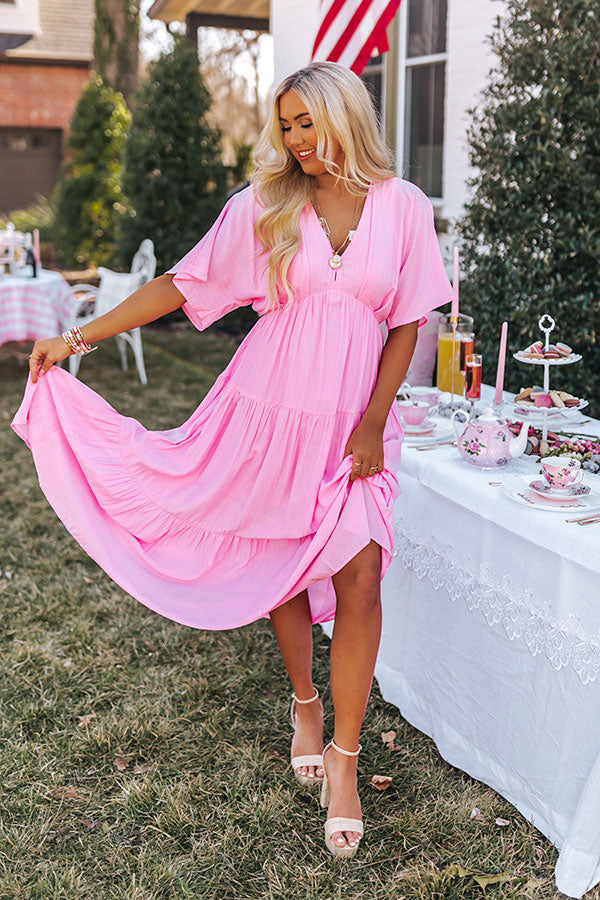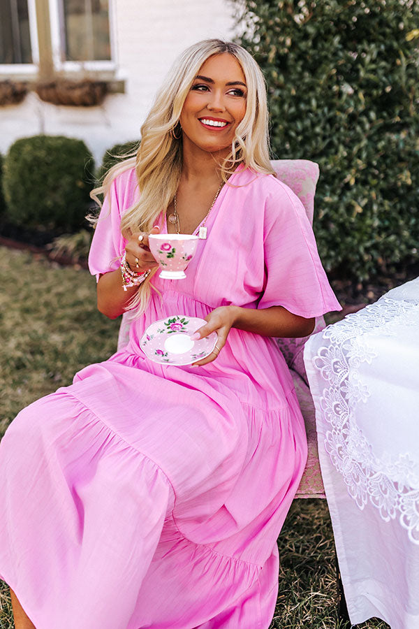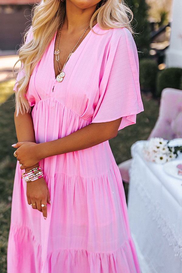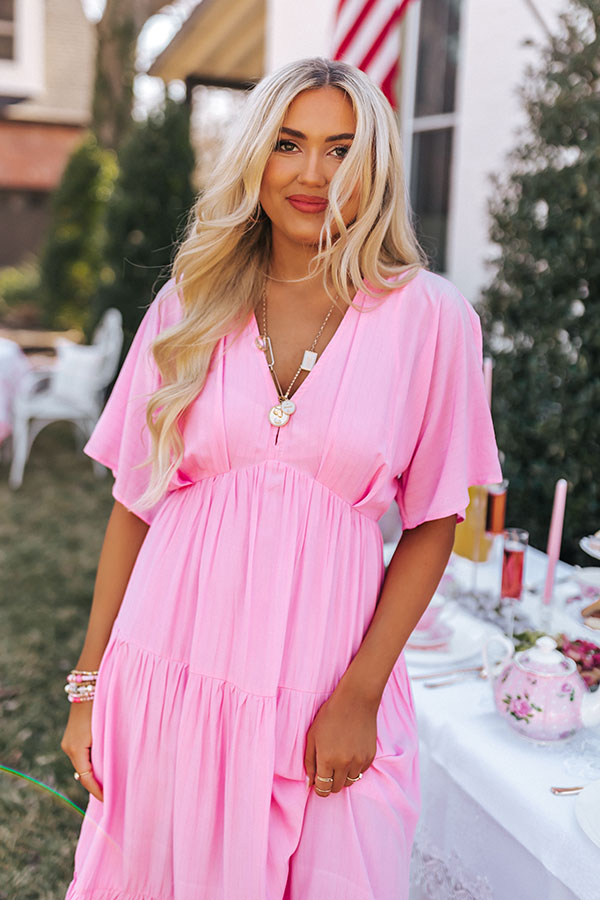 Be your own sunshine in this stunning pink maxi dress featuring lightweight material, a v-cut neckline, half sleeves, and a relaxed tiered skirt silhouette that cascades into a straight ankle-length hemline! Measurements