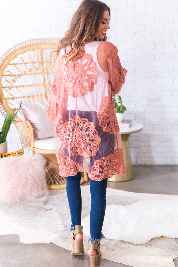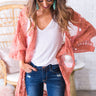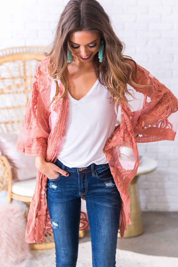 Throw this lightweight lace overlay over your favorite basic for the ultimate boho chic look! This crochet lace overlay has a breezy open front silhouette with tie closure & quarter-length sleeves.