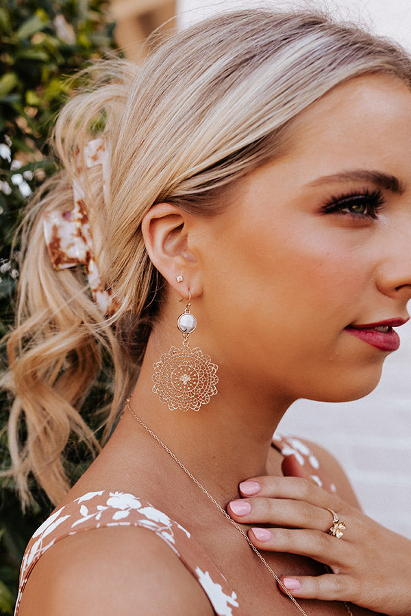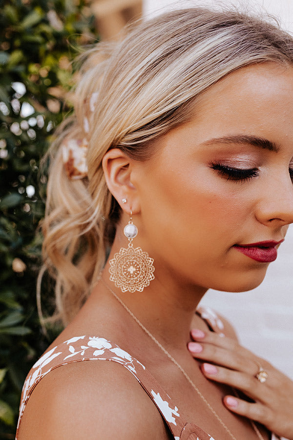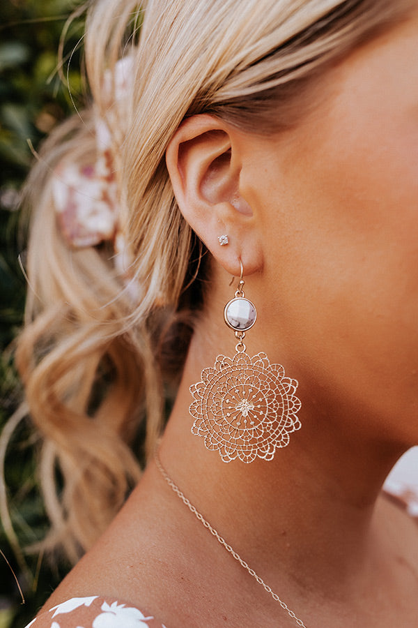Upgrade your look with our pretty 'Sunshine On The Horizon Earrings' featuring a dangling white stone and large intricate gold cutout pendant!
