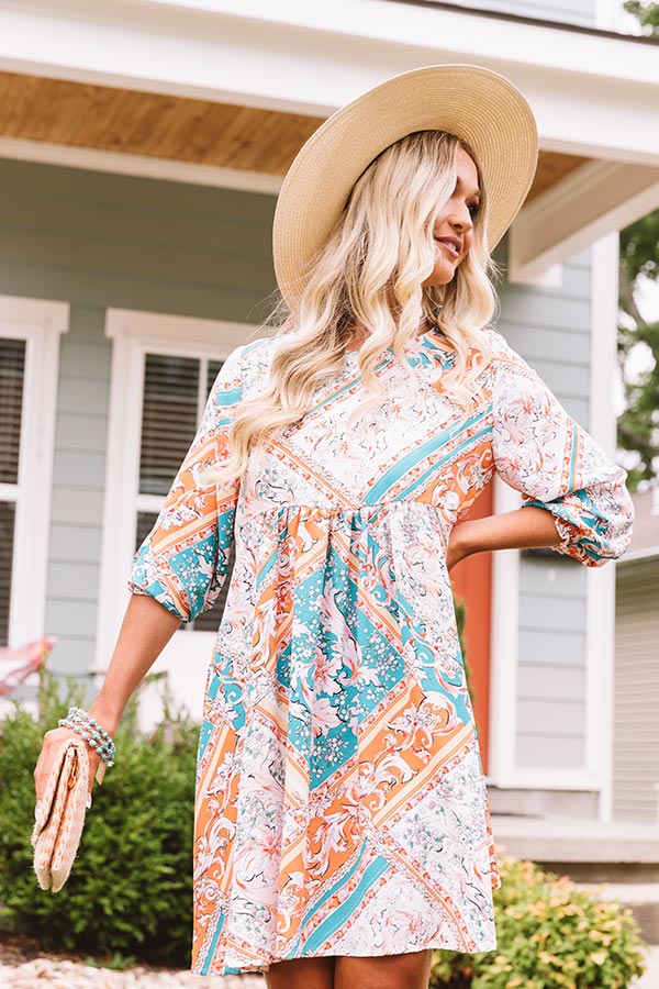 Leave a little sunshine wherever you go with this darling dress featuring lightweight breezy material patterned with abstract turquoise and orange hued prints, a high rounded neckline, loose half-sleeves, a keyhole accented upper back with a button closure, and a relaxed babydoll silhouette that falls into a straight mid-thigh length hemline! We have styled this cutie with a matching clutch and a woven block heel and hat! Measurements