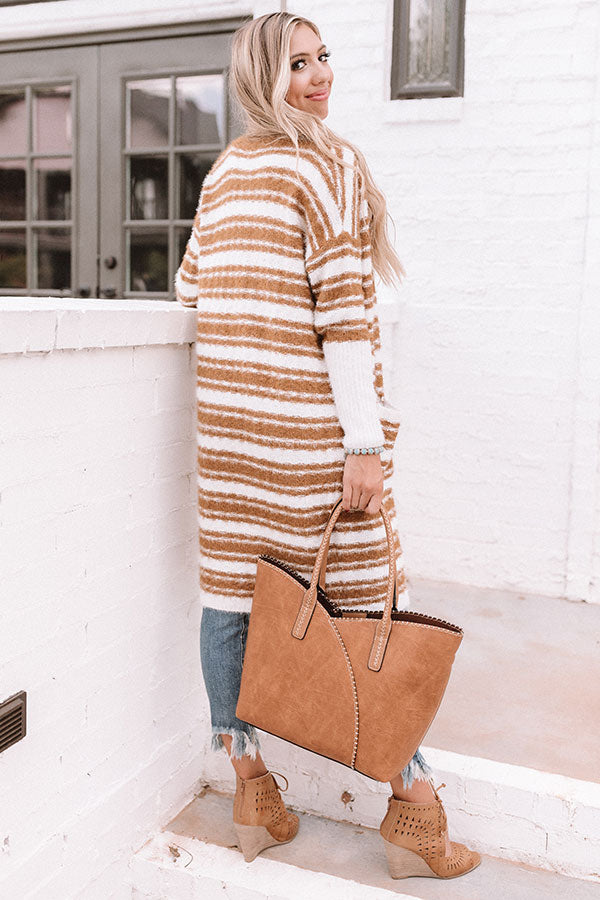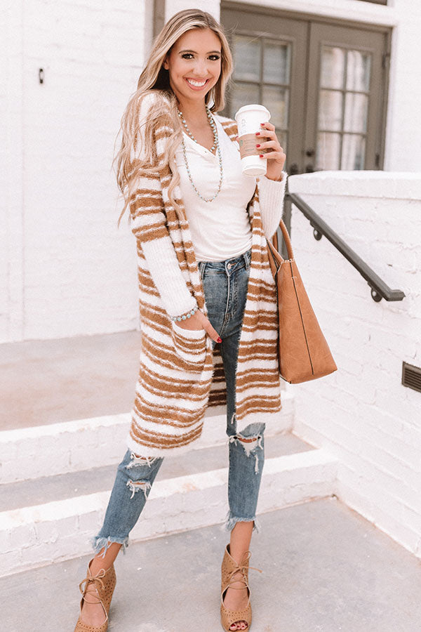 When going out to receive those "sunshine snuggles," stay stylish and cozy in this warm cardigan featuring lightweight loose knit material, long sleeves with fitted ribbed forearms, mustard and white horizontal stripes, hidden side pockets, and a relaxed open front silhouette that falls into a straight knee-length hemline! You can style this versatile piece with just about anything from a basic tank to a sweater, jeans to dresses, wedges to sandals, clutches to totes, and hats to earrings! Measurements