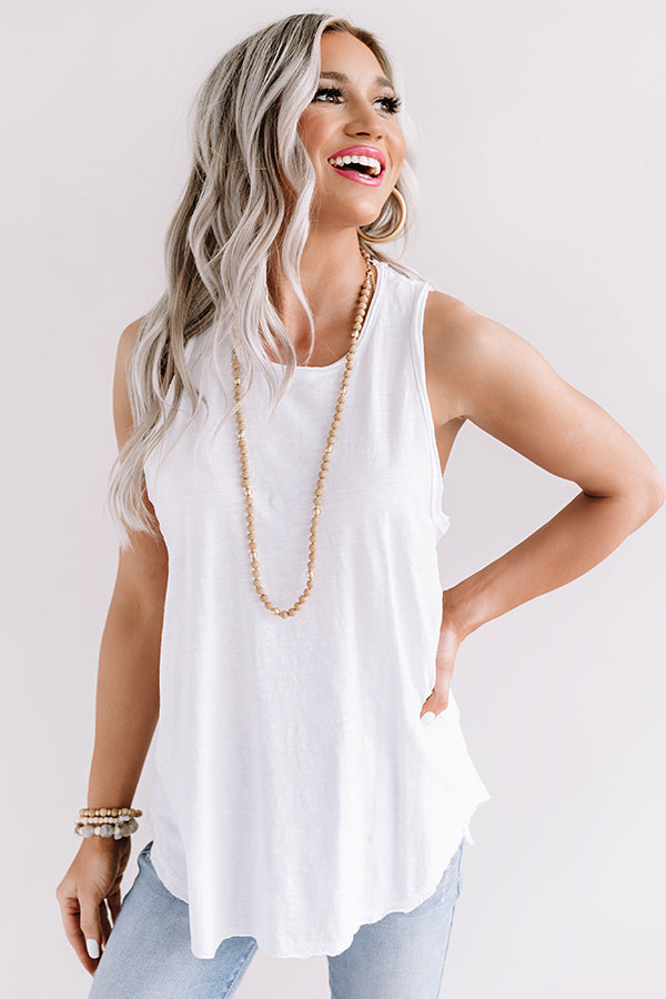 You won't find a better piece to wear during "sunshine weather" than this adorable casual white shift tank featuring lightweight breezy material, a scooped neckline, wide 3-inch sleeveless shoulder straps with a racerback fit, and an ultra relaxed silhouette that falls into a rounded hemline! Your styling options are endless with this versatile piece, like solo with some distressed ankle skinnies, snake print jute wedges, a long statement necklace, and a neutral crossbody, but you can also wear it layered under "The Perry Distressed Leopard Jacket" with some frayed black shorts, "The Ansley Sneaker," and our "Sunshine Suite Sunnies in Iced Latte!" Measurements