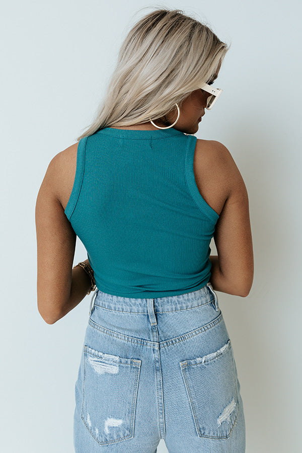 Perfect for wearing solo or layering, our versatile teal colored 'Surf And Tide' tank featuring lightweight and soft material, a rounded neckline, 2-inch sleeveless shoulder straps, and a flattering figure hugging silhouette that ends in a straight cropped hemline!