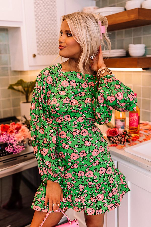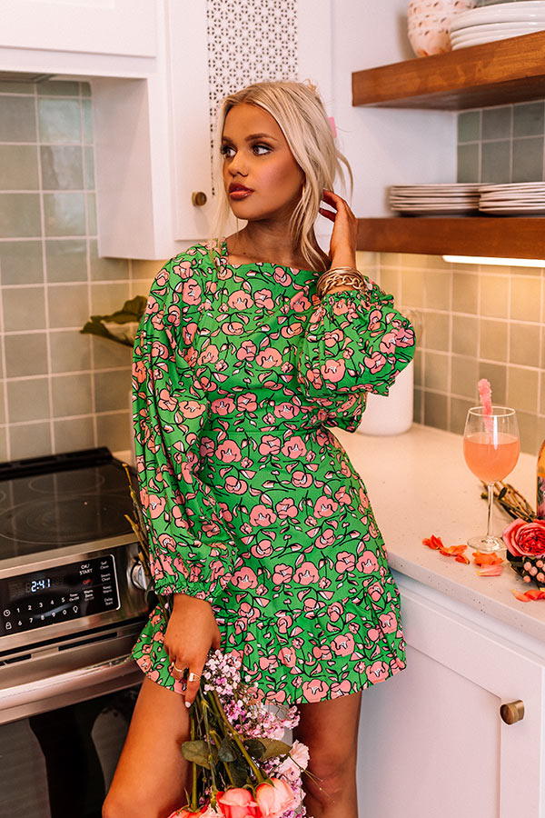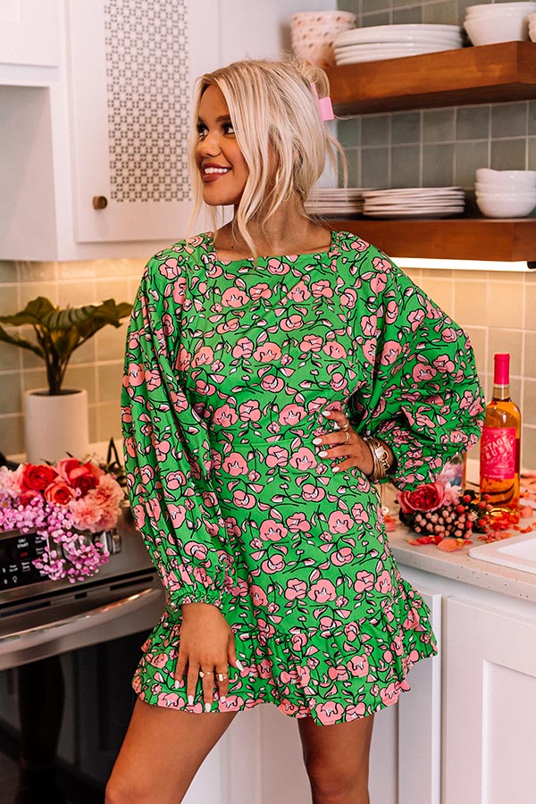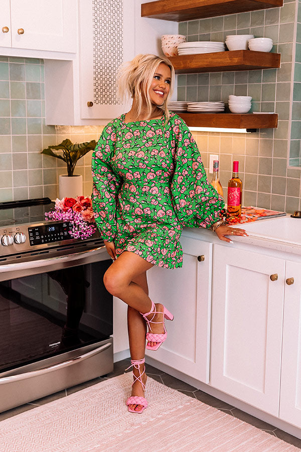 Jaws are sure to drop when you arrive in our gorgeous green 'Surprise Party' dress featuring lightweight material patterned with an adorable pink floral print, a high square neckline, long oversized bubble sleeves, a cinched waistline, an open back with a tie closure, and a relaxed skirt silhouette that ends in a straight mid-thigh length hemline!