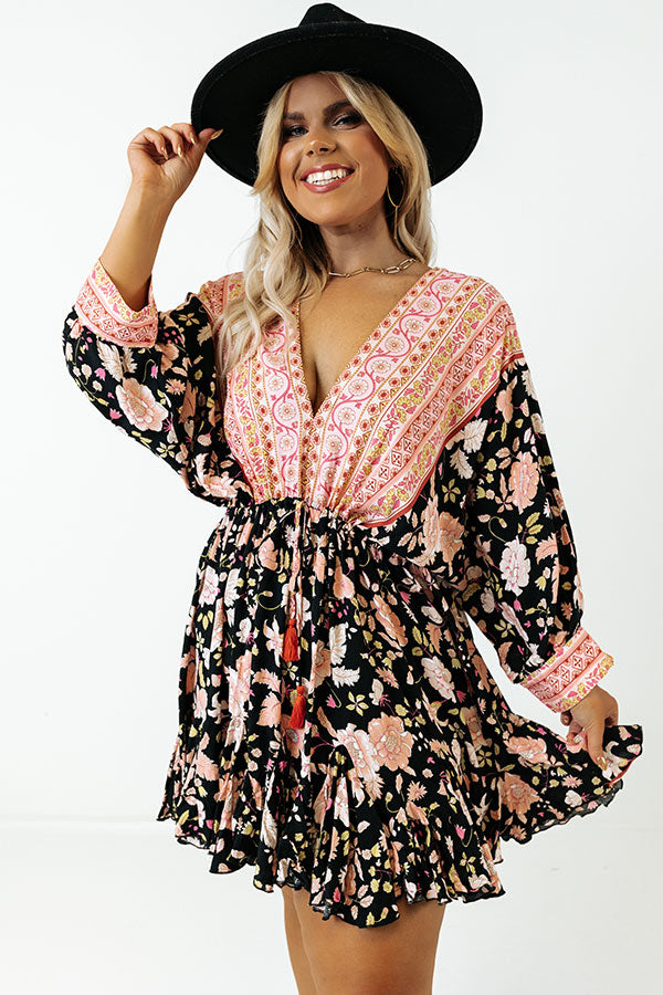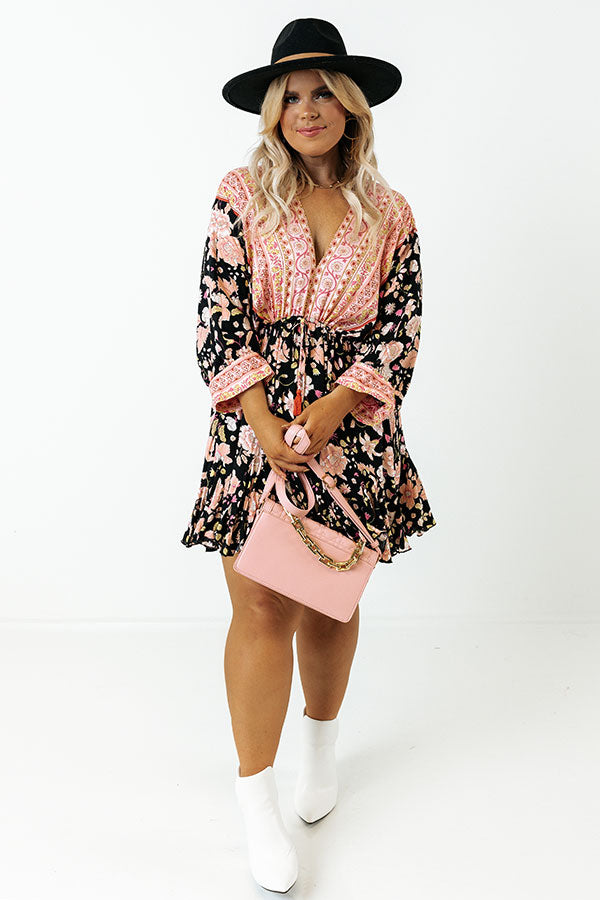 Let your style bloom with our pretty 'Surprise Trip' dress featuring lightweight material patterned with a variety of intricate pink and mustard floral prints, a v-cut neckline and upper back with a tie closure, a cinched tie closure waistline, loose 3/4-length sleeves, and a relaxed silhouette that falls into a straight mid-thigh length hemline!