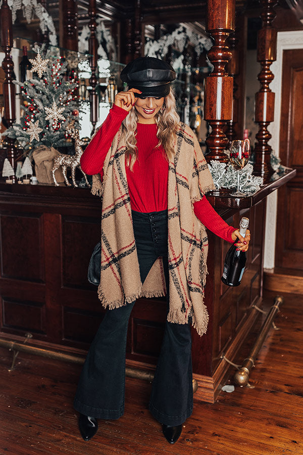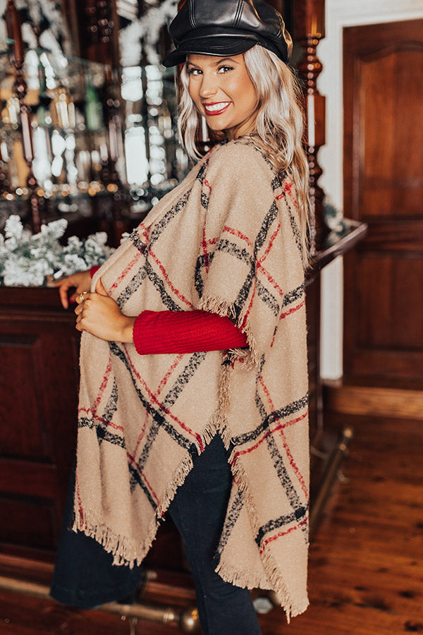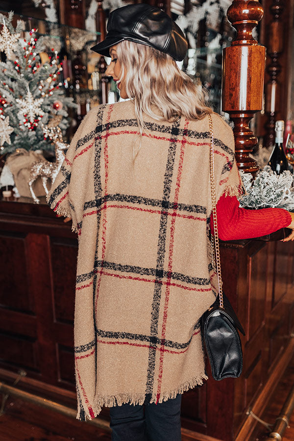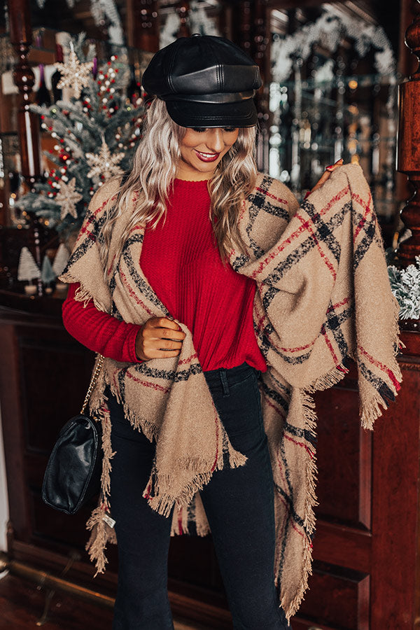 Drape yourself in warmth for the holidays with our chic tan hued' Swapping Notes' poncho featuring lightweight knit material patterned with a large black and red plaid print, fringe trim detailing, short oversized sleeves, and an ultra draped open front silhouette that cascades into a straight mid-thigh length hemline with side slits!