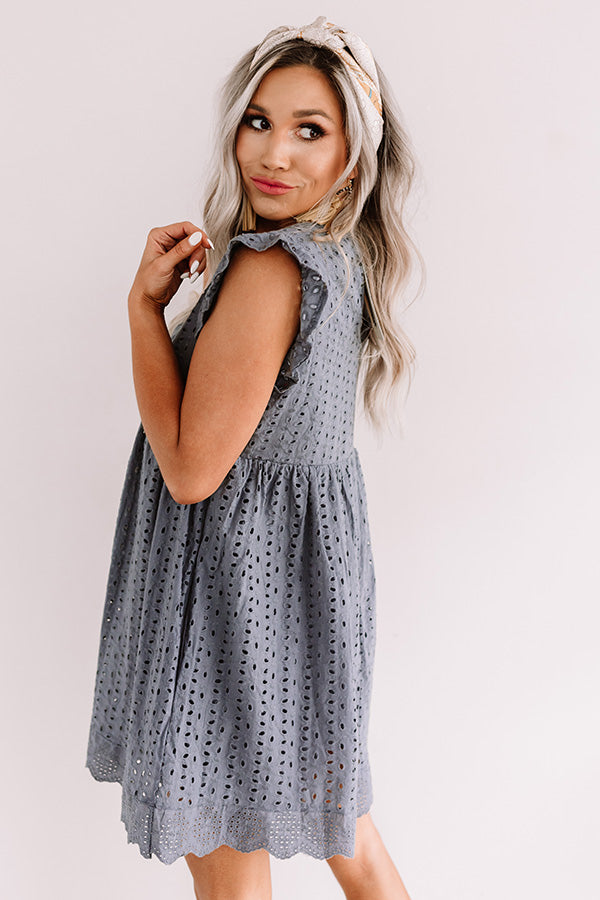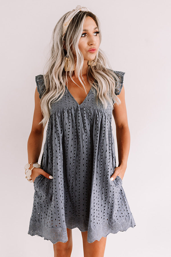 "Sway into style" with this adorable charcoal colored romper featuring lightweight material, wide shoulder straps with ruffled trim, eyelet detailing, a v-cut neckline, a keyhole accented upper back with a button closure, accent side pockets, and a flowy silhouette that falls into an uneven hemline with lace detailing! PLUS, it features a matching slip! Measurements