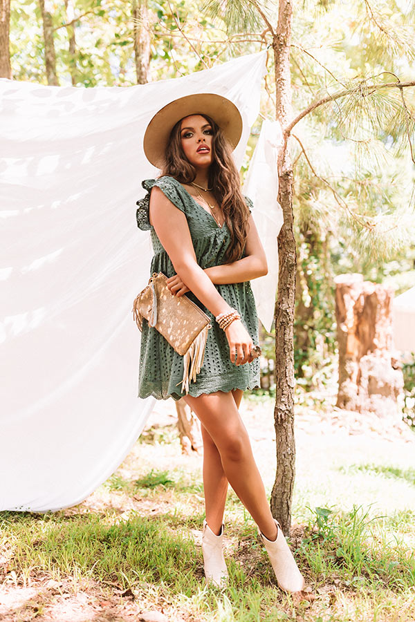 "Sway into style" with this adorable olive colored romper featuring lightweight material, wide shoulder straps with ruffled trim, eyelet detailing, a v-cut neckline, a keyhole accented upper back with a button closure, accent side pockets, and a flowy silhouette that falls into an uneven hemline with lace detailing! PLUS, it features a matching slip! You can pair this delicate piece with a neutral peep toe bootie, fringe clutch, and wool hat, but you can also wear it layered under a jean jacket with "The Alba Wedge in Ivory!"