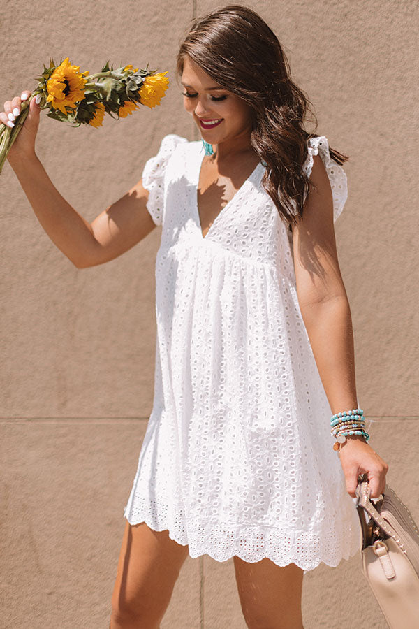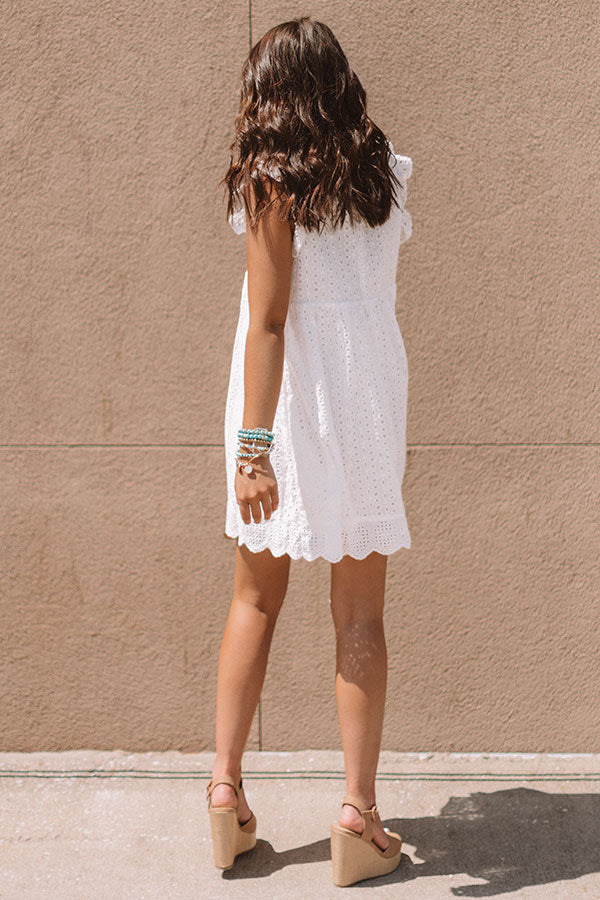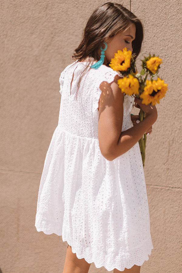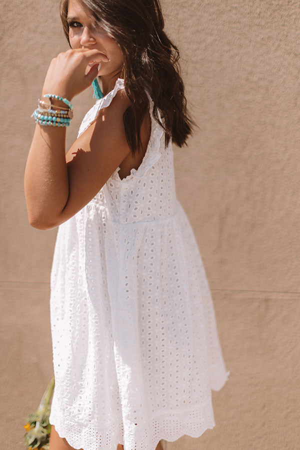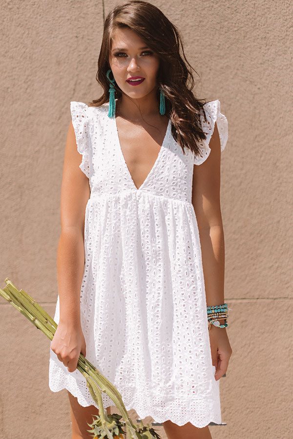 "Sway into style" with this adorable white romper featuring lightweight material, wide shoulder straps with ruffled trim, eyelet detailing, a v-cut neckline, a keyhole accented upper back with a button closure, and a flowy silhouette that falls into an uneven hemline with lace detailing! PLUS, it features a matching slip! You can pair this delicate piece with turquoise statement jewelry and a neutral wedge and crossbody, or you can style it layered under a cropped jean jacket with "The Nixie Lace Up Heel in Pink" and our "Pebble Beach Party Scrunchie!"