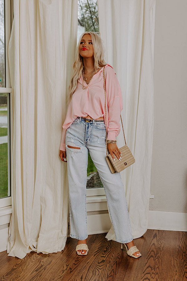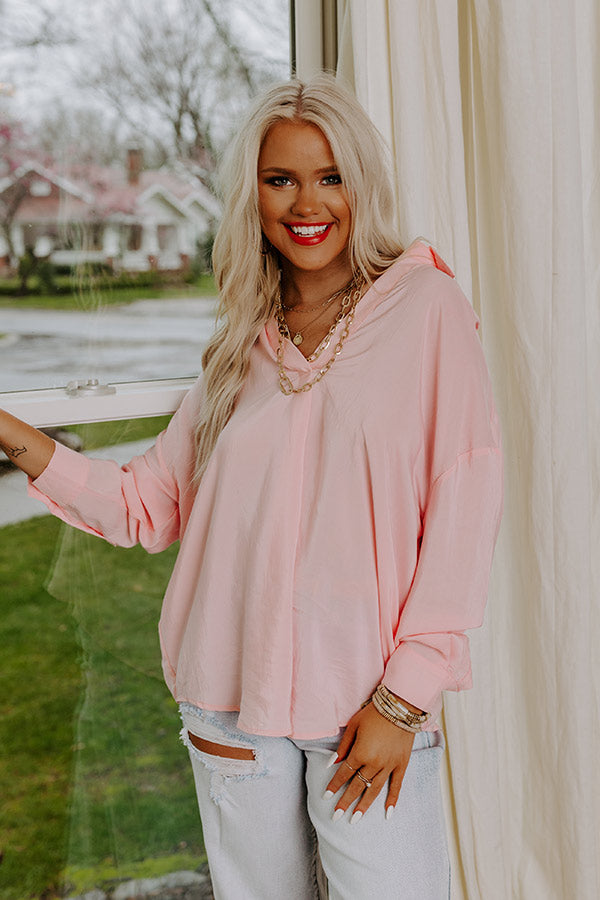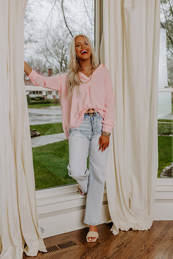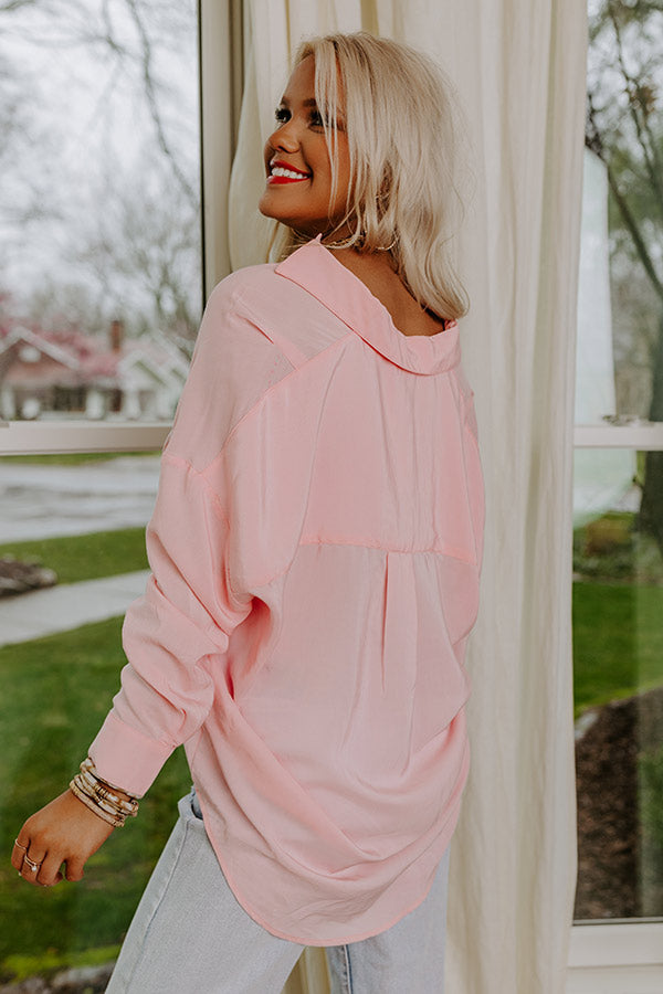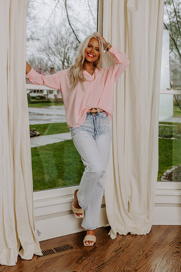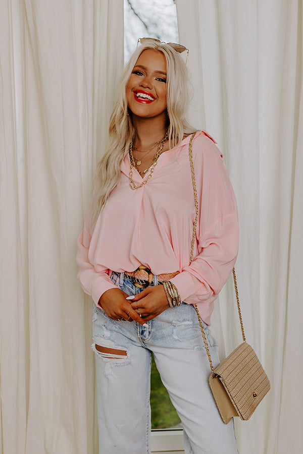 Slay all day in this white casual cute pink shift top featuring sleek lightweight material, a collared v-cut neckline, long loose sleeves with button closure cuffs, and a draped silhouette that falls into a rounded tunic-length hemline! on products