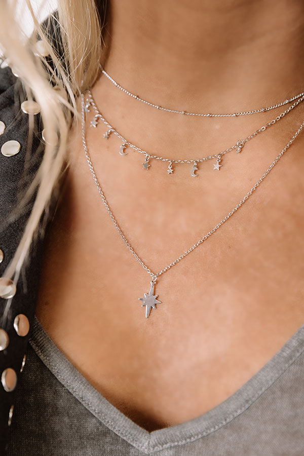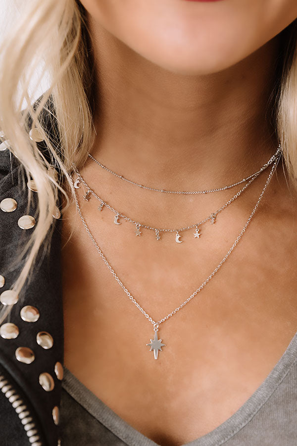 Reach for the stars with this adorable silver layered necklace featuring a choker, a medium length chain with tiny star and moon charms, and a longer chain with a star pendant!