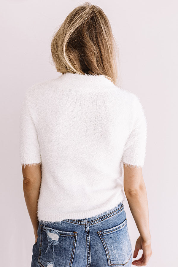 Show off your "sweet and divine" fall style with this pure white top featuring ultra soft lightweight tight knit material with eyelash fringe detailing, a high turtle neckline, tight half length sleeves, and a fitted but relaxed silhouette that falls into a straight cropped hemline! This layering basic can be styled with some distressed ankle skinnies and a statement belt and earrings, or it can be worn under our "Sweet As Pumpkin Pie Stripe Cardigan" and tucked into some black flares or a skirt with "The Seraphina Faux Leather Wedge in Taupe" and a matching tote and faux suede hat! Measurements