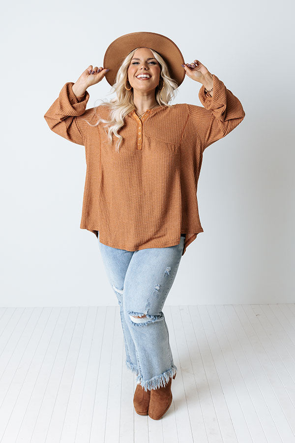 Keep it basic but beautiful in our versatile plus size rust colored 'Sweet And Sincere' top featuring lightweight material with subtle waffle knit texturing, a button up bodice, long loose sleeves, and a relaxed silhouette that falls into a rounded hemline!