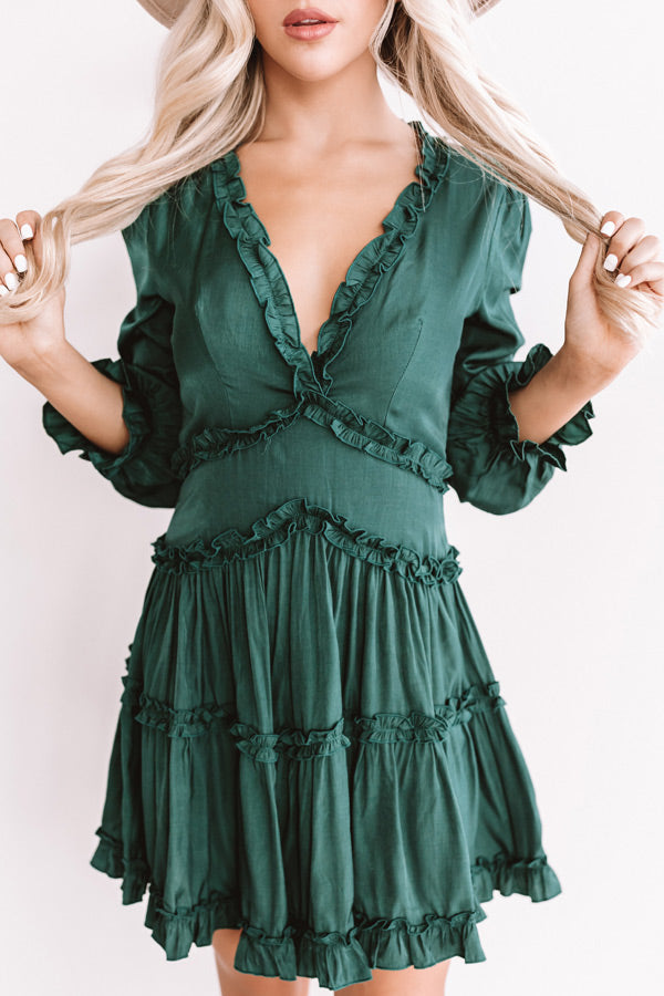You will undoubtedly look "sweet AND stunning" in this hunter green dress featuring lightweight material, a v-cut neckline, ruffled detailing, long loose quarter length bishop sleeves with smocked cuffs that flare slightly, a zip up closure back, and a fitted bodice that falls into a tiered flowy babydoll skirt with an uneven mid-thigh length hemline! We have styled this piece with a snake print clutch and a neutral cutout wedge and faux suede hat, but you can also wear it with "The Jess Faux Suede Heel in Grey" and our "Summer In Versailles Earrings in Grey!" Measurements