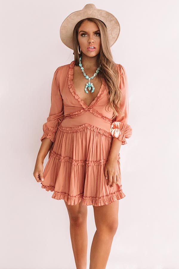 You will undoubtedly look "sweet AND stunning" in this light rust colored dress featuring lightweight material, a v-cut neckline, ruffled detailing, long loose quarter length bishop sleeves with smocked cuffs that flare slightly, a zip up closure back, and a fitted bodice that falls into a tiered flowy babydoll skirt with an uneven mid-thigh length hemline! We have styled this piece with a snake print platform heel, turquoise statement jewelry, and a neutral fringe crossbody and faux suede hat, but you can also pair it with "The Seraphina Faux Leather Wedge in Grey!" Measurements