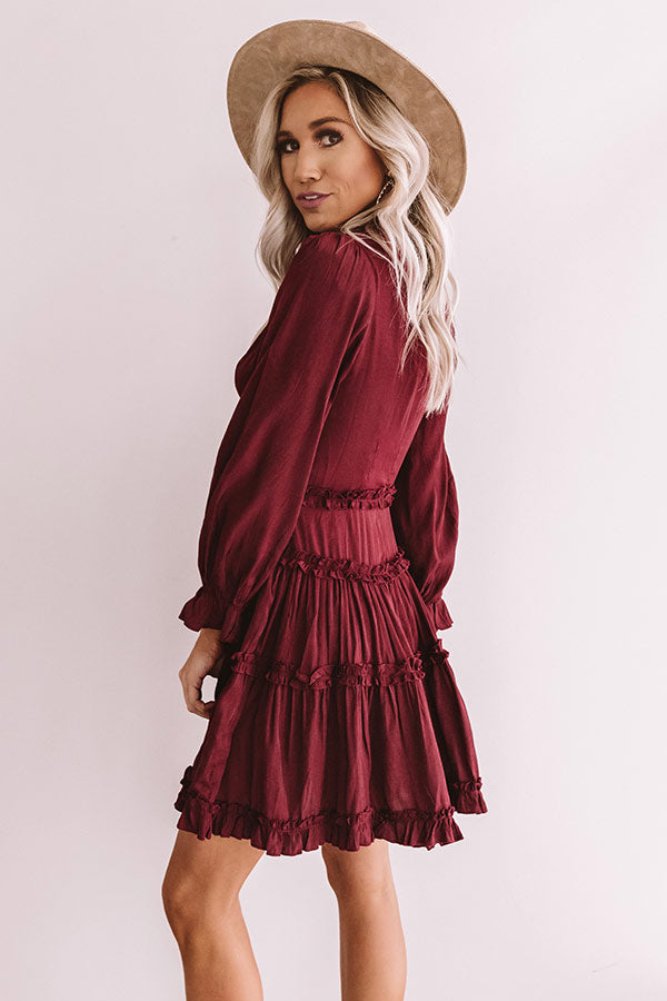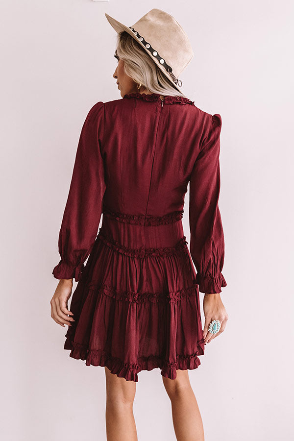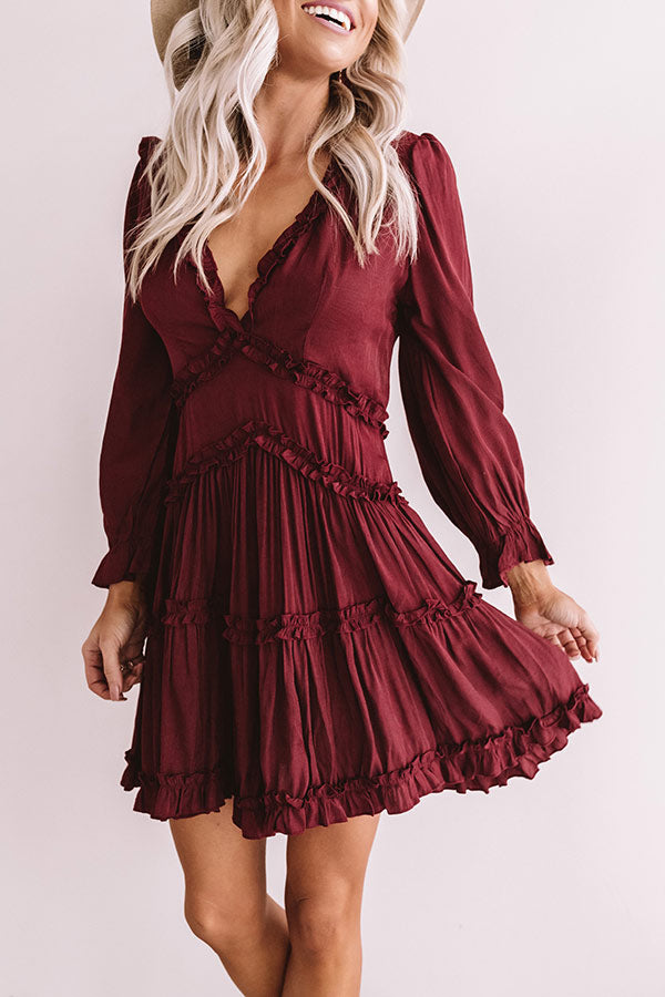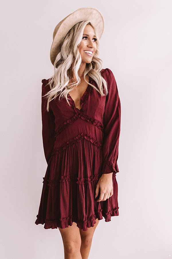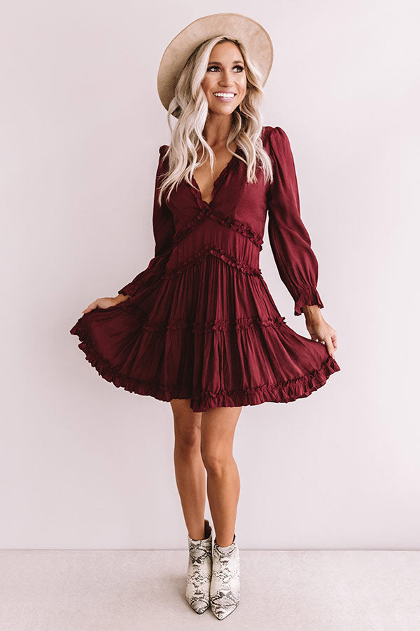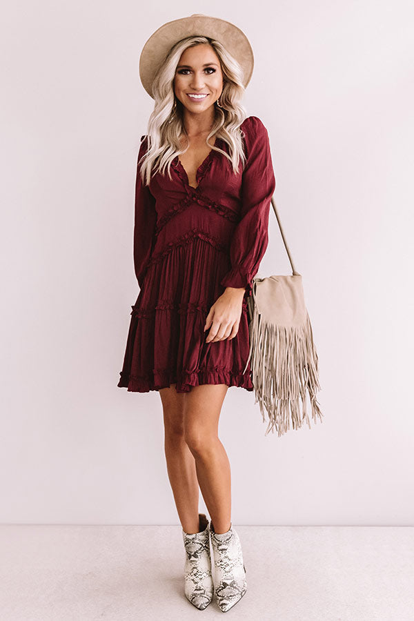 You will undoubtedly look "sweet AND stunning" in this merlot colored dress featuring lightweight material, a v-cut neckline, ruffled detailing, long loose quarter length bishop sleeves with smocked cuffs that flare slightly, a zip up closure back, and a fitted bodice that falls into a tiered flowy babydoll skirt with an uneven mid-thigh length hemline! We have styled this piece with some snake print booties and a neutral fringe crossbody and faux suede hat, but you can also pair it with "The Seraphina Faux Leather Wedge in Grey!" Measurements
